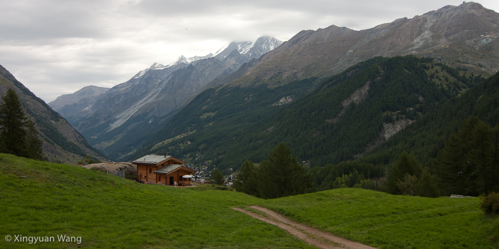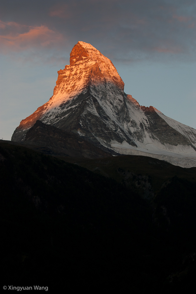 The Matterhorn herself glowed for a few minutes before the color disappeared from her north face. Incidentally, the next day there wasn’t nearly as much color. I had high hopes initially, as the clouds around the mountain were in the right spot to catch some color, but they had moved on by the time the sun rose. Contrary to what might seem intuitive, some cloud cover is good for sunrise shots. Too much and it blocks the view of whatever you’re trying to photograph (unless it’s the clouds themselves), but too little and no color shows up. I didn’t do anything to the RAW file of the left picture (Saturday’s sunrise); I bumped up the foreground in the right picture (Sunday’s sunrise) in order to show the depth of the valley. Like Rainier, the Matterhorn towers over its inhabited lowlands.