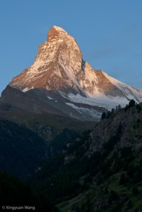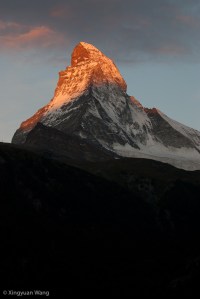 I roamed around my hotel, looking for a place to get a clear shot of the Matterhorn while still keeping an eye to the south and west to see if the sky would light up at all. By 6:15, the sun had clearly risen a bit and there really wasn’t much color, so I figured I’d just sit around and see what the Matterhorn would look like in the morning sun. I turned around to see how things were looking away from the mountain and saw some incredible colors starting to pop. So it was that my first “moody” sunrise shot wasn’t even of the Matterhorn, but I thought it was interesting nonetheless. I don’t like the crop on this, but there were roofs at the bottom of the frame… so I’ll have to live with this one. ;-)