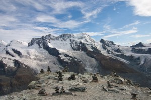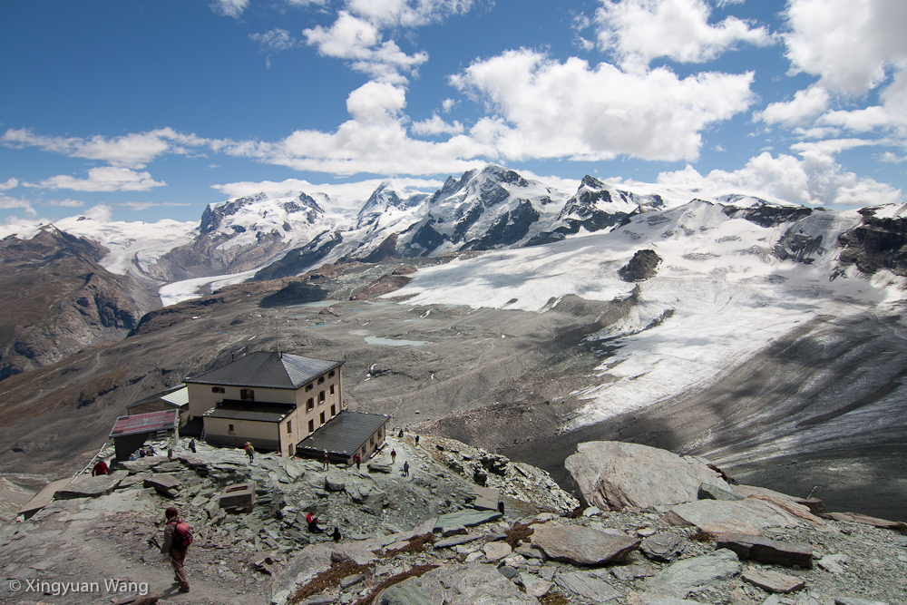 Most information says the hike is about 2 hours up; this seemed to be rather accurate. I made it up in less time while taking a few pictures along the way, but most people on the trail were taking their time. If you want to plan for it, 2 hours one way is probably the safe bet. Hiking to the hut was kind of reminiscent of hiking on the Sunrise side of Rainier (e.g. 2nd Burroughs). There’s a lot of loose scale-like rock, steep drop offs on the trail, and no snow. Even at 14,700 feet, there was no snow — a typical trek up to Muir will show you snowpack by 7,500 feet (just after Pebble Creek, if you’re keeping track of these details), but there was nothing here. Good news for me, as I had neither hiking boots nor gaiters. I should also point out here that the cable cars did much of the work. The Hörnlihütte is at 3260 m elevation and Zermatt at 1620 m; the Schwarzsee cable car station is at 2583 m. Had I hiked the entire way from Zermatt (which is possible, by the way — there are hiking trails everywhere), the total distance would be a little longer and the elevation gain slightly more than the trip from Paradise to Muir. Also unlike the hike to Muir, where the base camp really isn’t visible for most of the trek, the hut stands in prominent view at every other switchback. It’s a little frustrating to be panting and telling yourself not to look down at the valley below and still see the little SOB still towering above you, not seeming any closer. Anyhow, at the hut, which is pretty crowded (like Muir), it’s possible to “scramble” a bit and get up another forty feet or so. The view, free from other obstructions at last, is pretty neat.
