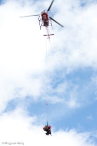 I wasn’t at the hut for very long when I heard an unfamiliar noise (on a mountain, anyhow): a helicopter was landing at the helipad (“H” flat area left of the building). It parked for a minute, left toward the mountain, then came back; this time, it stayed for a little bit longer, but when it rose again, attached to it was a long rope and a person at the end of the rope. It departed for the mountain again. On its second return, it was now carrying three people at the end of the rope.