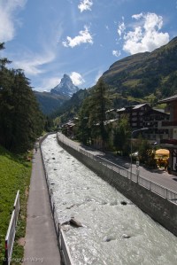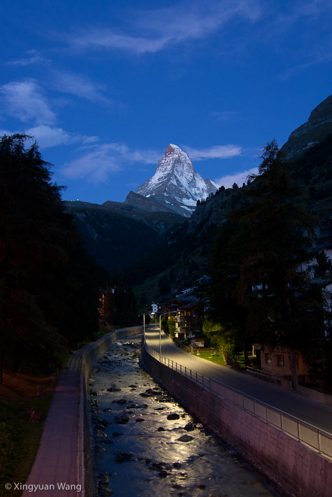 Sunday morning brought some interesting surprises — there were a lot (maybe 40 or 50) tourists all standing where I wanted to take my sunrise shot. I decided to try another location and let them have their fun, but not before I could get this comparison shot. The River Vispa runs through Zermatt and offers an interesting but almost too-contrived glimpse at the Matterhorn from downtown.