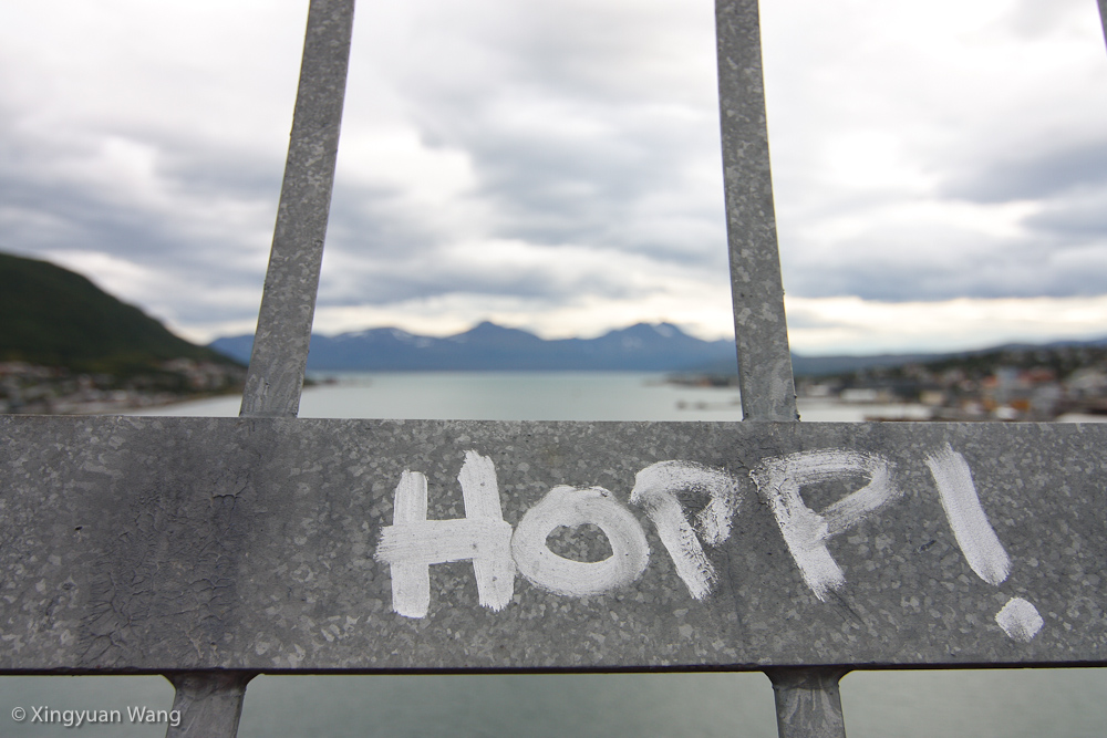 After wandering around some more, I ended up on the bridge connecting Tromsø to the mainland to watch the northbound Hurtigrute (M.S. Midnatsol) leave for the even farther north, where there were no trees. My pictures were quite shoddy — not that these aren’t — but I did come across another message.