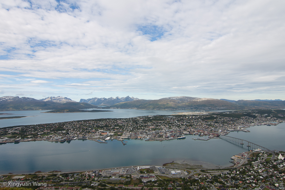 After napping for a few hours and then eating a typical Norwegian breakfast — or what this tourist thinks is a typical Norwegian breakfast — I did the touristy thing and took a cable car to the top of a nearby mountain. My knee was still bothering me a bit from something I did to it in Zermatt a week ago, so I didn’t want to hike the trail up, which was the alternative. Tromsø, as is revealed from above, is actually an island; it’s not on the mainland of Norway. Maybe this is the reason it’s sometimes called “Paris of the North” — Paris is known as Île de France; Ile, isle. Who knows. It’s not likely to be mistaken for Paris in most other ways. (Not at all a bash of Tromsø, but a Paris it isn’t. Lovely it is.)