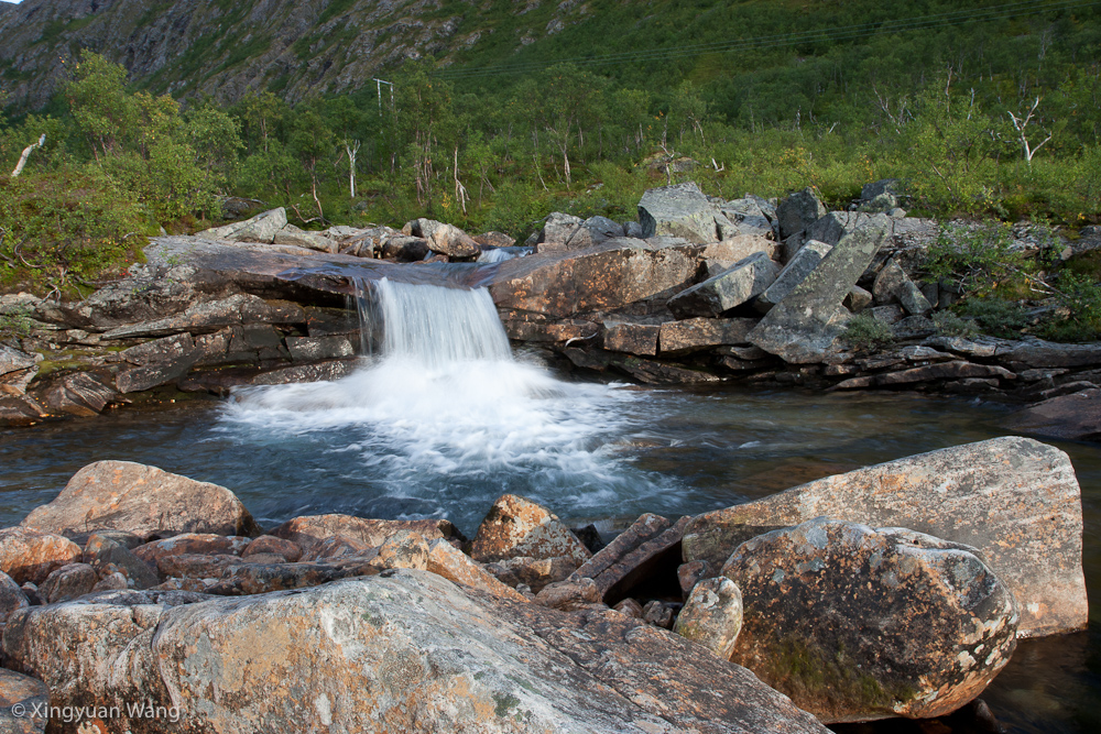 There were a few hiking trails at the top of this mountain, but I didn’t want to reaggravate the knee so I decided to head back into town and drive around the area a bit. One recommended drive was to hit the island Kvaløya. While driving back, I heard and then saw some small waterfalls. The biggest probably had a drop of only 4′, but it was kind of neat to walk across some marshy ground and take a picture of it in what was still broad daylight. Awesome light, this.