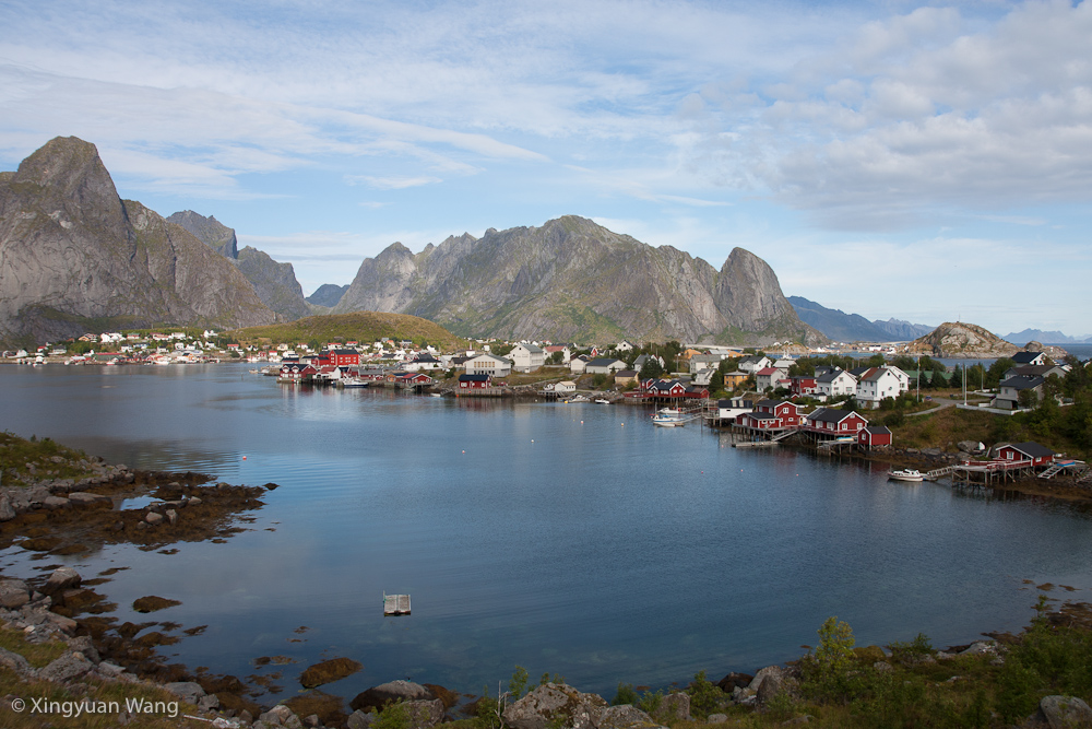 I’m scared of heights — or rather, of the falling sensation which I associate with heights — and decided not to do the bouldering route up a 20′ pinnacle for the true summit of Reinebringen. Even so, this — in a few ways — was the high point of what I envisioned my trip would be and of the trip as it played out. From the parking lot near the trailhead, the village of Reine suddenly seemed more compact.