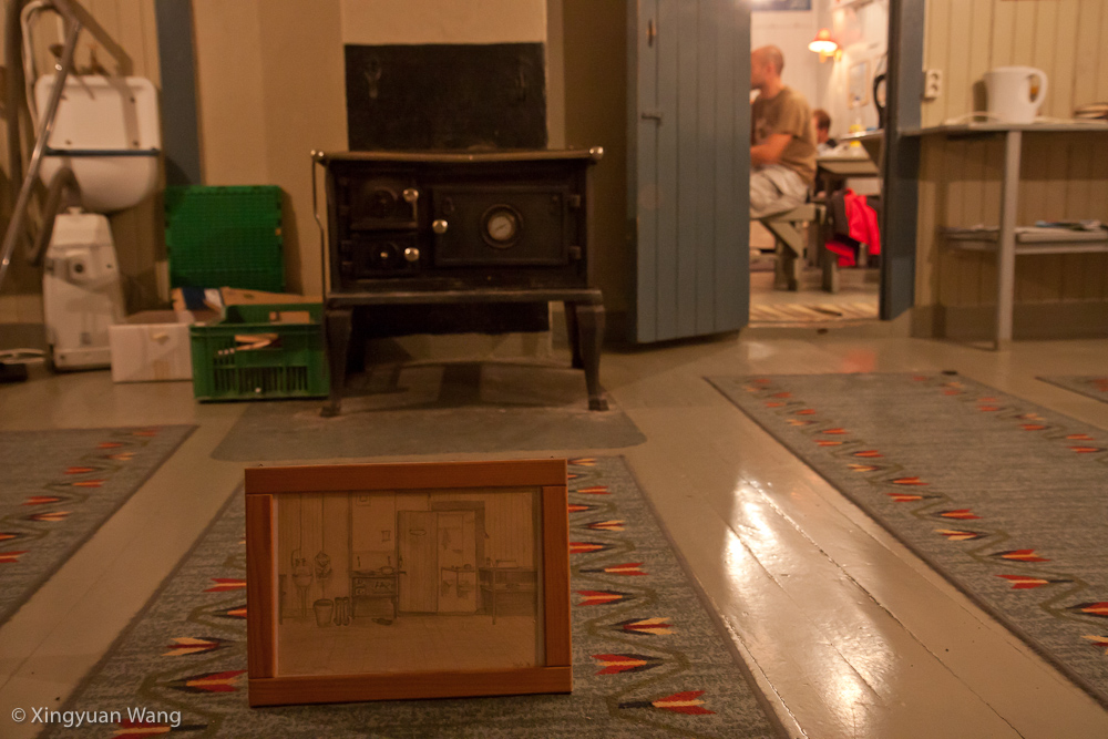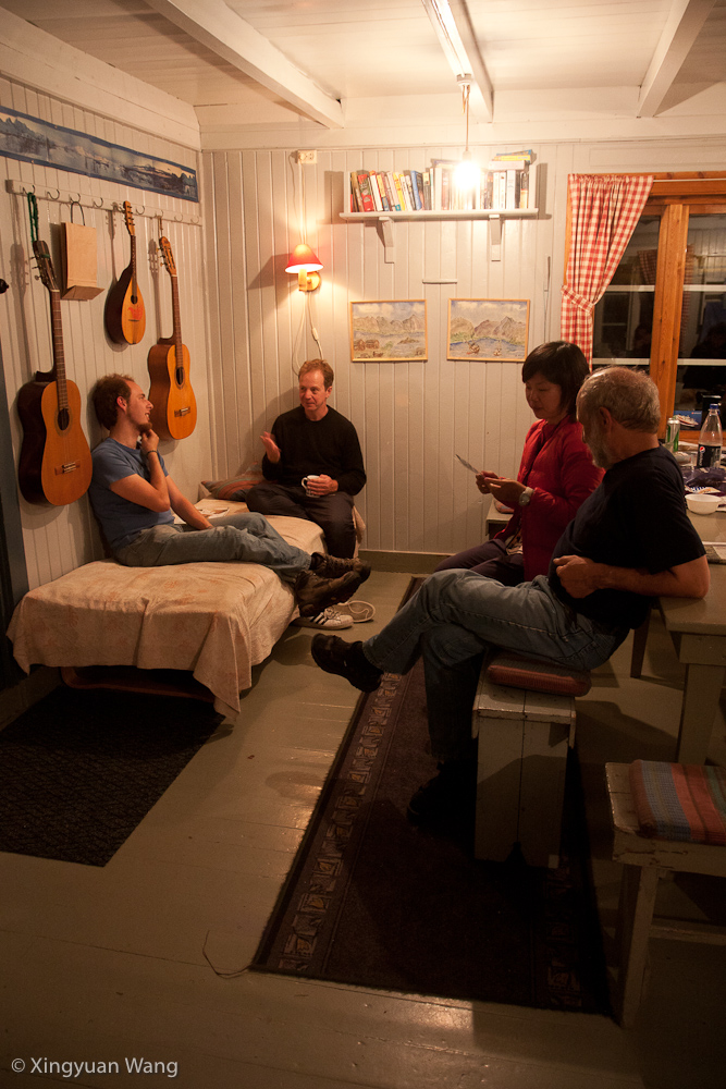Back at the hostel, I went fishing with an Australian couple and quickly learned that a) I’m a terrible rower and b) that I’m a terrible fisherman. To be fair, a Swedish couple had gone out earlier and returned later and had poles and a net and only caught one fish, so I didn’t feel too badly about our lack of a prize. Borrowing fish from the freezer (still only a whopping three days old), we made fish and chips that night. It was the best night I experienced in the hostel. There were three groups cooking their own thing — our fish and chips, another one doing a fish pie, and another doing pasta — and we had a wood stove going for warmth; the weather had turned sour and temperatures had dropped probably 5 °C from the time I left Justatind, and the entire hostel smelled amazing. I chauffeured the two Australians to the Hurtigrute, took some night pictures I didn’t like, and returned to the hostel for my final night.