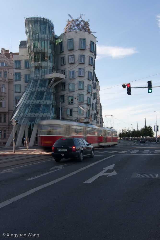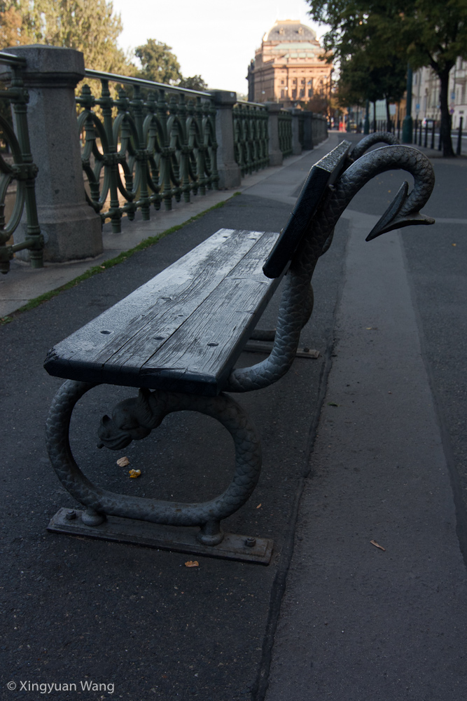 The goal of my early morning jaunt was to visit the Dancing House. For all our wandering through Prague, we had managed to come within a block of Frank Gehry’s famed design a few times but never actually to it. This time I followed the river all the way to the Jiráskův Bridge and stopped for a few photos of the house. On the way there, I saw an interesting bench design… not sure what to make of it.