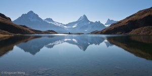 I decided after much deliberation that I’d try to return to Kleine Scheidegg to catch the sunrise on the second day and play it by ear after that. Unfortunately, I failed to notice that Kleine Scheidegg doesn’t actually get the morning sun. Given the [travel logistics] impracticality of trying to hit Bachalpsee for a genuine sunrise or sunset and that I really wanted to see the lake with calm water, I decided to take the first train from Kleine Scheidegg to Grindelwald and go back to Bachalpsee rather than hike at the foot of the Eiger. I think the decision was a good one. I was one of the first few to get to the lake, and the water stayed calm for long enough, if just barely: the winds had picked up in the twenty minutes I was there, and the lake surface became as choppy as it was the day before.