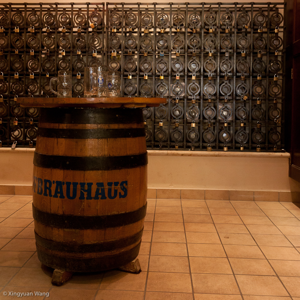 We went to the Hofbräuhaus for dinner. The place really lacks a devoted clientele, and it took us half an hour to pounce on a table as soon as its patrons so much as twitched for a jacket. When it wasn’t tourists occupying the beer hall, regular customers would retrieve their personal Maß from a small room. (n.b. This image stinks. I’m not good at taking pictures in private areas to begin with and am even more nervous when waiters and waitresses carrying twelve liters of beer are about to trip over me!)