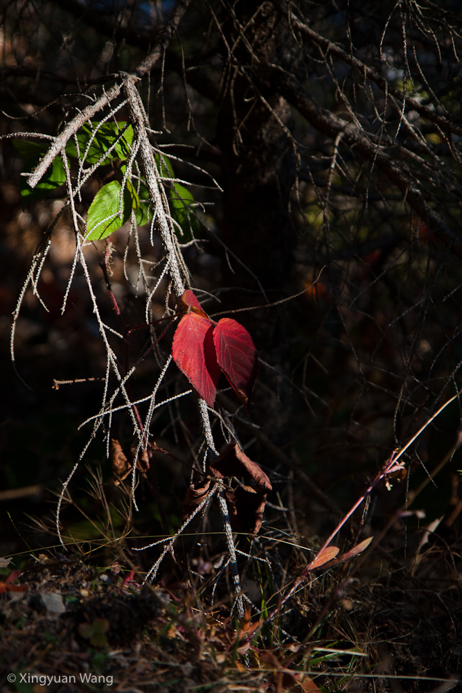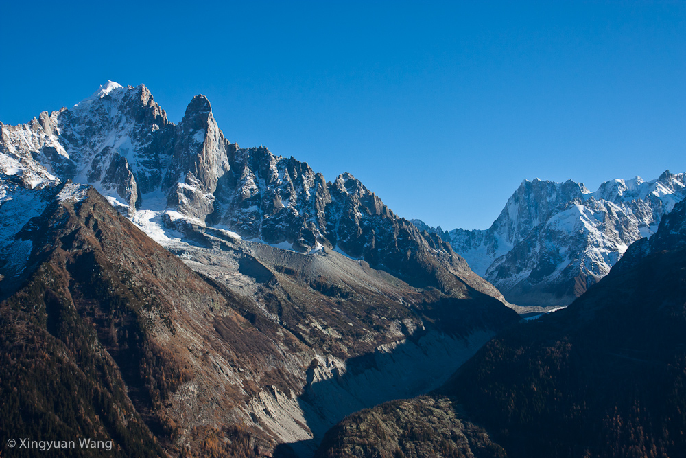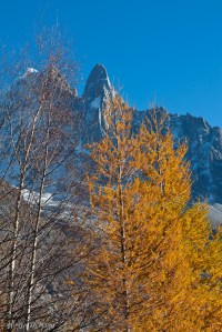 … which was terrible. It wasn’t that it was overly strenuous — it wasn’t — but that I kept trying the wrong trail. The trails indicated on the map weren’t the ones I wanted to be on (or at least had deviations due to route maintenance), and with trail signs that weren’t hugely helpful like they tend to be in Switzerland, it took me an hour and a half before I finally found the one that led up to La Flégère, my interim destination for the day. It was 2 PM by the time I got there, and my secondary goal of continuing to Lac Blanc was at this point not a safe consideration. The lighting was also pretty unpleasant; it was a combination of back- and sidelighting, which combined with the strong afternoon sun really didn’t make for flattering pictures. I was happy to get two “interesting” (i.e. to me at the time; nothing to say the photos themselves are that interesting) scenes along the way: curiously-lit leaves and the contrast between a tree that had shed its leaves, and one directly next to it that still had its needles.