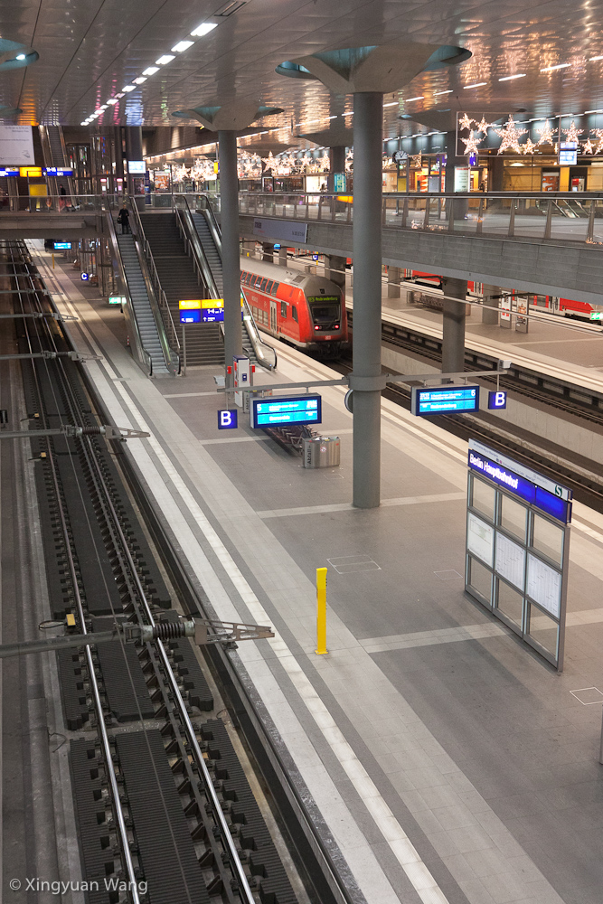 I still don’t know what happened exactly, but three windows on the ICE1090 were damaged en route to Frankfurt. It was not announced if they were damaged by natural causes (tree branches, rocks) or by gunshots, but regardless, we were delayed getting into Berlin’s main station. It’s quite an impressive station: five levels of glittering lights, a huge Christmas tree, and shops selling just about everything. Puts the Paris Est and current Stuttgart stations to shame.