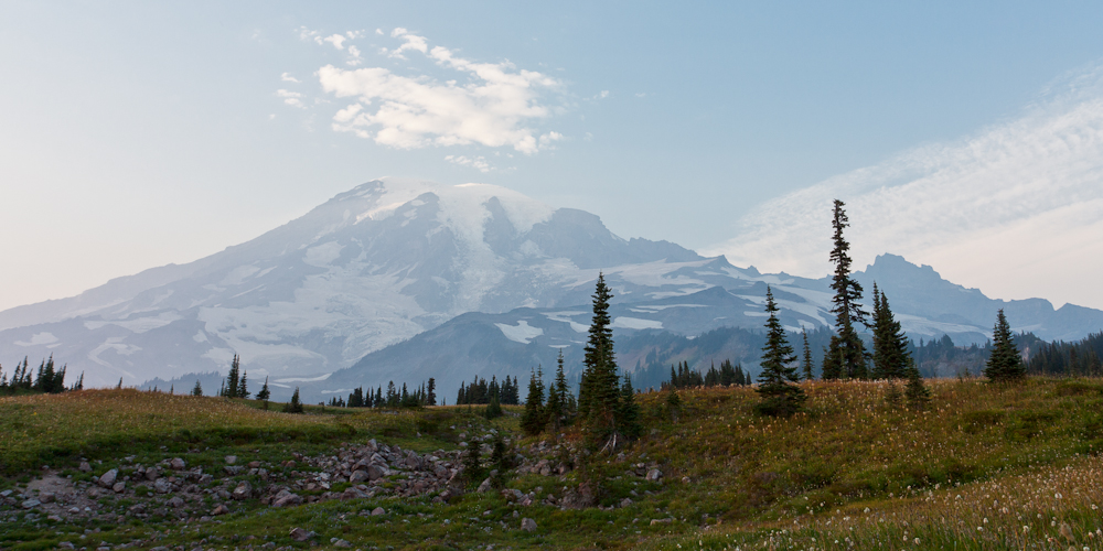 I arrived in Paradise on Friday afternoon and immediately set off for Mazama Ridge, but this time the trees weren’t draped in snow. I’ve been wanting to see a sunset (or sunrise) from the hills overlooking the visitor center for a few years now and found a spot where I’d be able to gulp down a cold dinner and smile to myself as the sun set. With the wildflower season over, smoke from the forest fires, and clouds out to the west, I didn’t get the color show I was hoping for, but I was thrilled to be at the mountain again regardless.