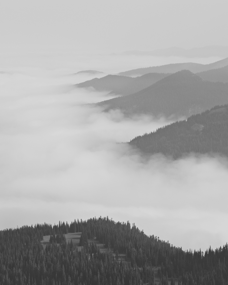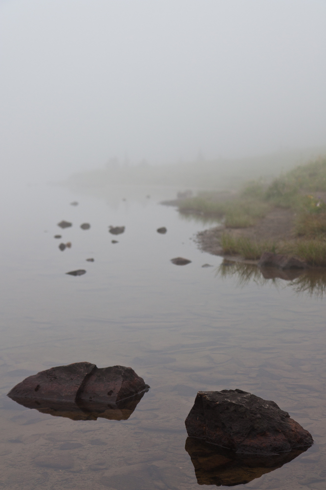 I hiked back down to Paradise and set off for my night stop at Tipsoo Lake. It’s a surprisingly accessible reflection pond for Rainier, and at sunrise with the right clouds the mountain positively lights up beautifully. On Friday night, I could see the stars above me but there was heavy ash from the forest fire drifting around me; I set an alarm for sunrise and called it a night. The next morning, I could see no stars and no mountain: the entire area was bathed in fog.