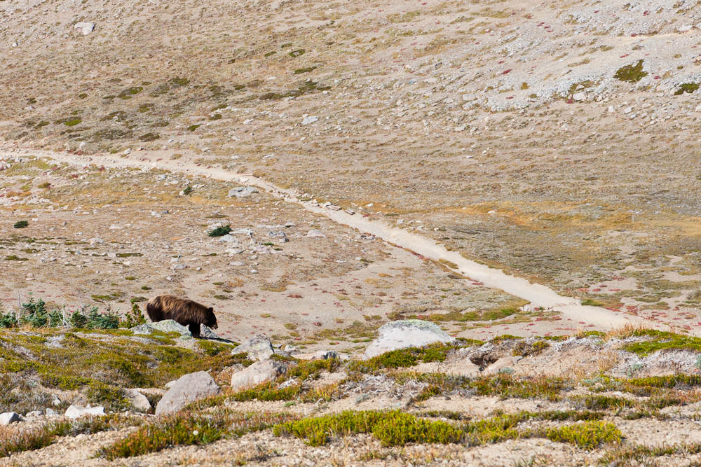 After lunch, I moved quickly back toward Sunrise, thinking I’d get the chance to also hit Dege Peak (which also offers a commanding view of Rainier and the mountains surrounding it). Right around Frozen Lake, however, a couple from Chicago informed me there was a black bear by the trail up to the Burroughs — odd place for a bear, I thought, given the proximity to people and lack of significant food. Nevertheless, there it was, eating berries and occasionally taking note that a crowd had gathered 100 yards away to watch it munch. It was typically good planning on my part: I brought my telephoto zoom with me but left it in the car. I had to work with my normal hiking zoom (the Canon 17-55) and wondered a few times whether it’d be worth it to book it to my car and back for a tighter shot. I didn’t think the bear would stay still for that long, so mostly grinned at it for an hour before heading back to the parking lot.