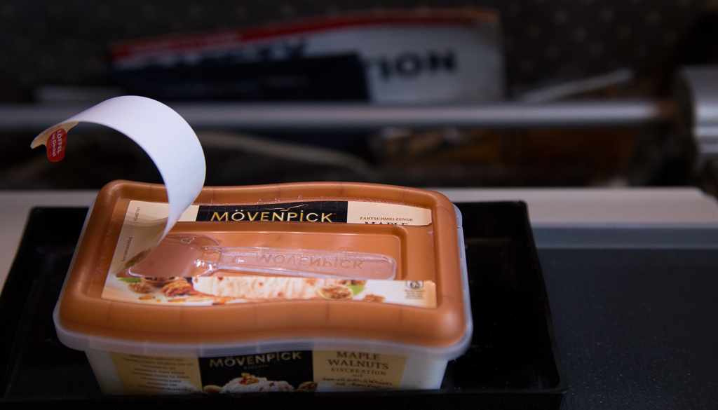(Nerd comment 1: that dark grey mat under the ice cream tray is really anti-slippery, so everything on the tray stays completely put. Cool! Not so cool: there’s no friction between the underside of the tray and the tray table, so the whole tray still slides. Nerd comment 2: nice packaging on the spoon! Nerd comment 3: premium airlines still use steel utensils, even in Economy. Apparently in some parts of the world, service still trumps cost. Take note, airlines of America. This is how it’s done.)