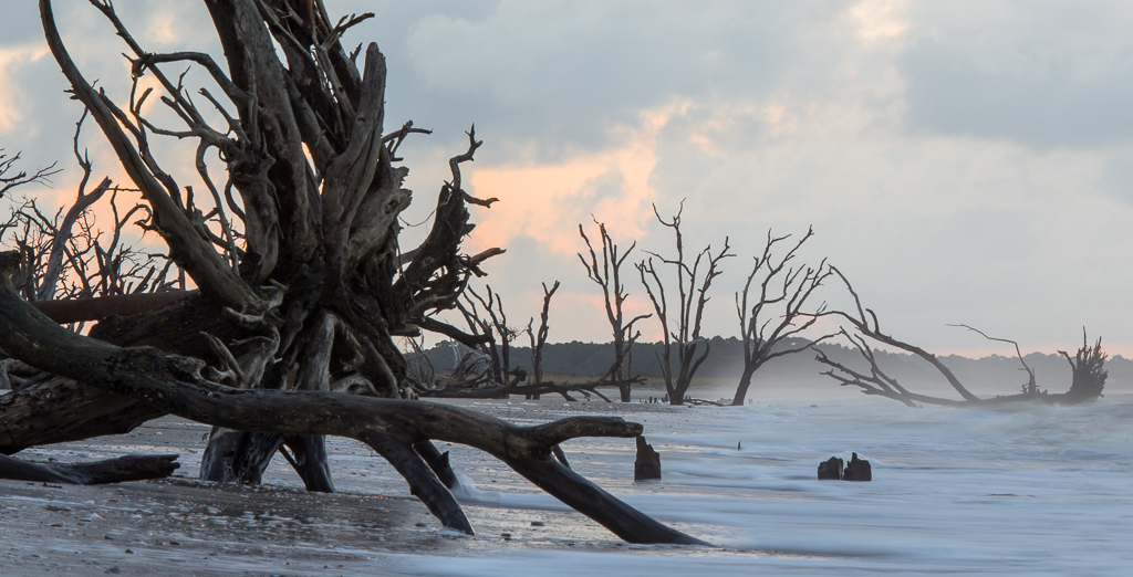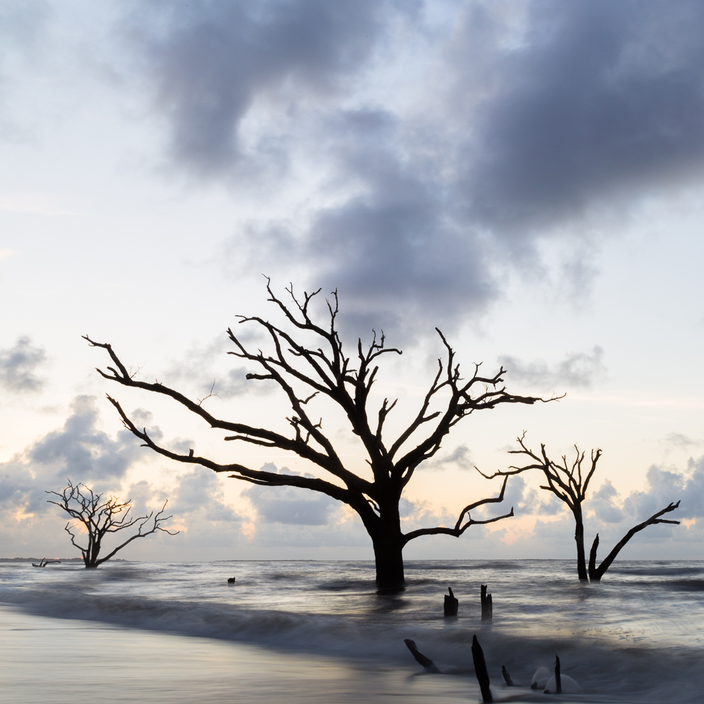One week after the distillery and sunset at Edisto Island, I headed to the Boneyard at Botany Bay to see if I could get some pictures of the sunrise with the brooding trees in the foreground. Saturday morning looked to be clear, the tides were low, and I brought my bike with me so that the trek from the car to the beach took 1 minute instead of 10. The only thing I forgot was bug spray — and the sand gnats, noseeums, or whatever other aggravating pests are attracted to my Asian blood ate me alive. Blue hour was tranquil, but the low clouds blocked the sun during the precious minutes where the blue twilight gives way to bursting clouds. It didn’t take long to recognize, though, how interesting the trees could be during sunrise. I don’t know if they represent stoicism or if it’s just their moodiness that’s so captivating at dawn, but even in death the trees give a sense of life to the morning.