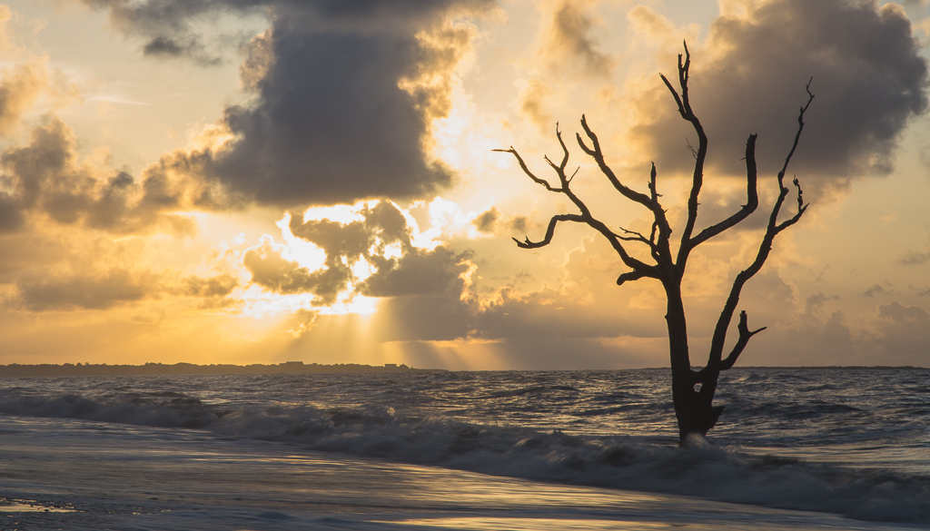 As the sun continued to rise, the sunbursts streamed through openings between the clouds as the tide slowly crept in — eventually splashing my camera with sea water and prompting me to bid farewell to the noseeums eating me alive.