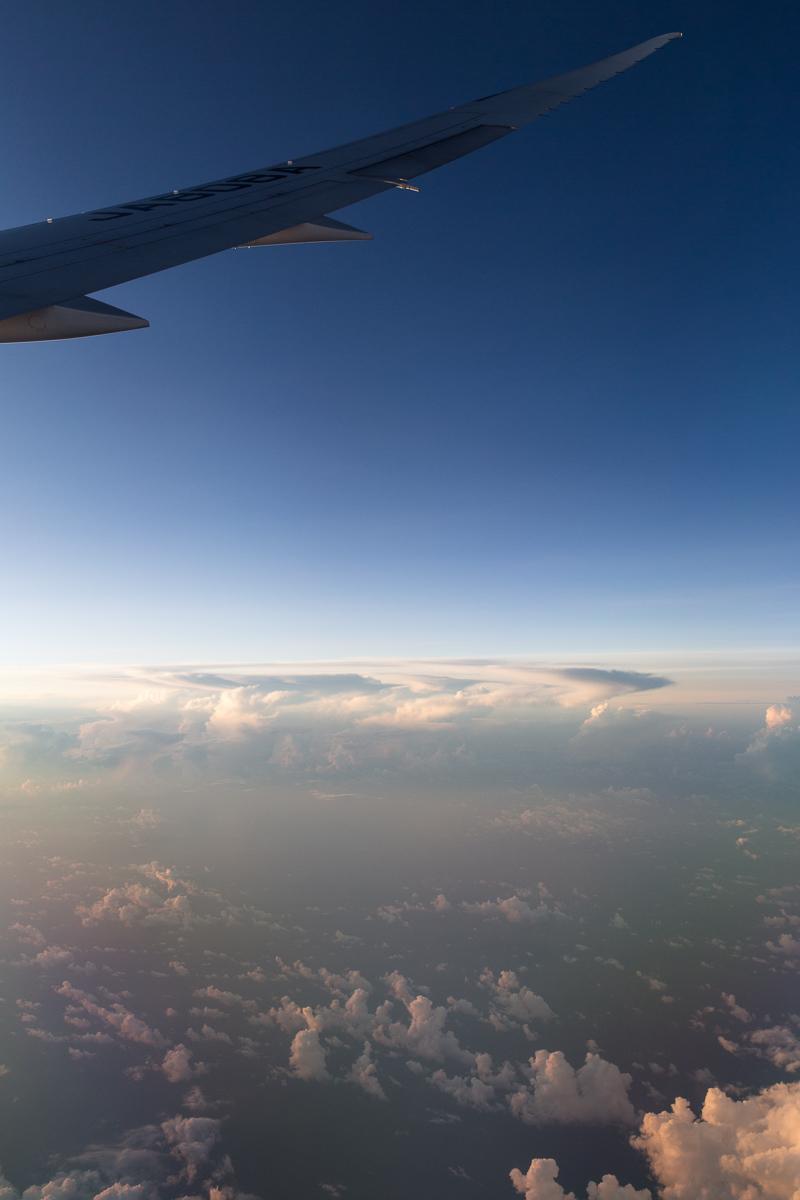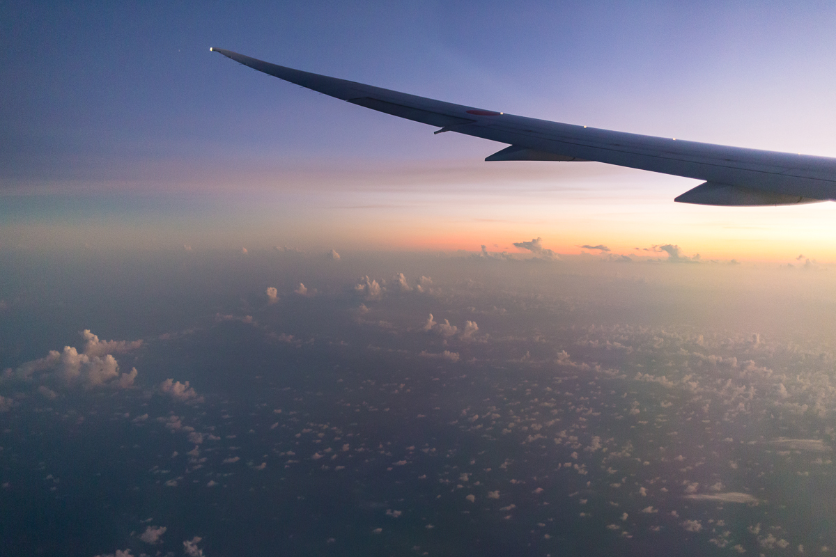 I lost track of time on my flight back to the US, but some dozen or so hours later, I was seeing my second sunrise. Unlike the first, which roared to life in a sea of orange and red after climbing out of the clouds, this one crescendoed gradually — my favorite. I was probably one of the few passengers awake, but seeing the GE90 peeking out under that wing… the 777 is a beautiful bird as it is but this silhouetted giant made my morning. Both of them. Or however that freaky two-sunrises-in-one-calendar-date thing works.