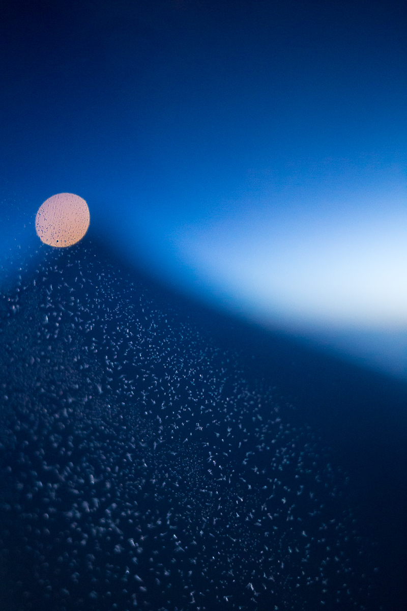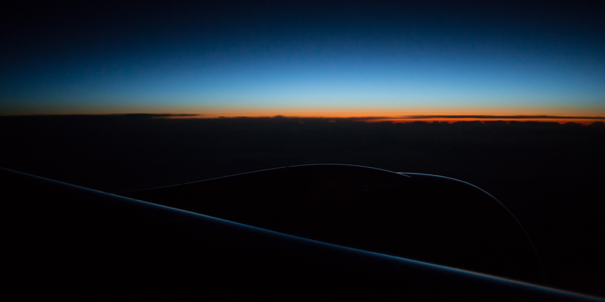 Almost immediately after takeoff, I was treated to sunrise. Breaking out of the clouds, we flew east and I watched the sky turn on. One thing I don’t like about the 787 windows: they have two panes of glass with a 2″ gap between them, making it very difficult to shoot dark scenes outside when the cabin lights are on. Because the windows darken electrochromically, they can also have an odd color tint. With a sunrise practically to myself and that majestic wing, though, all is forgiven. This is the way to spend a morning.