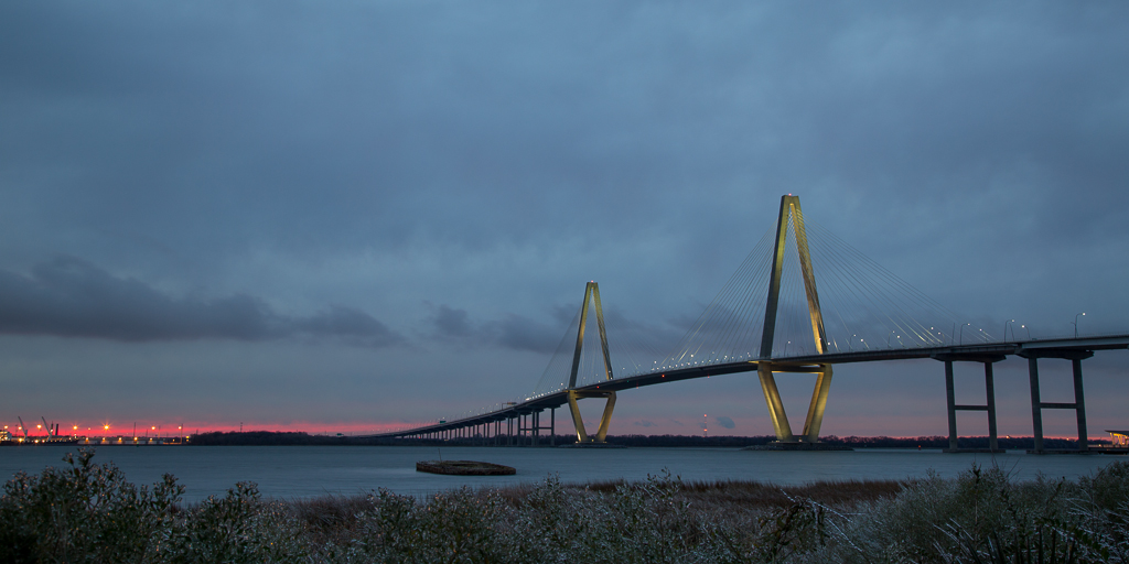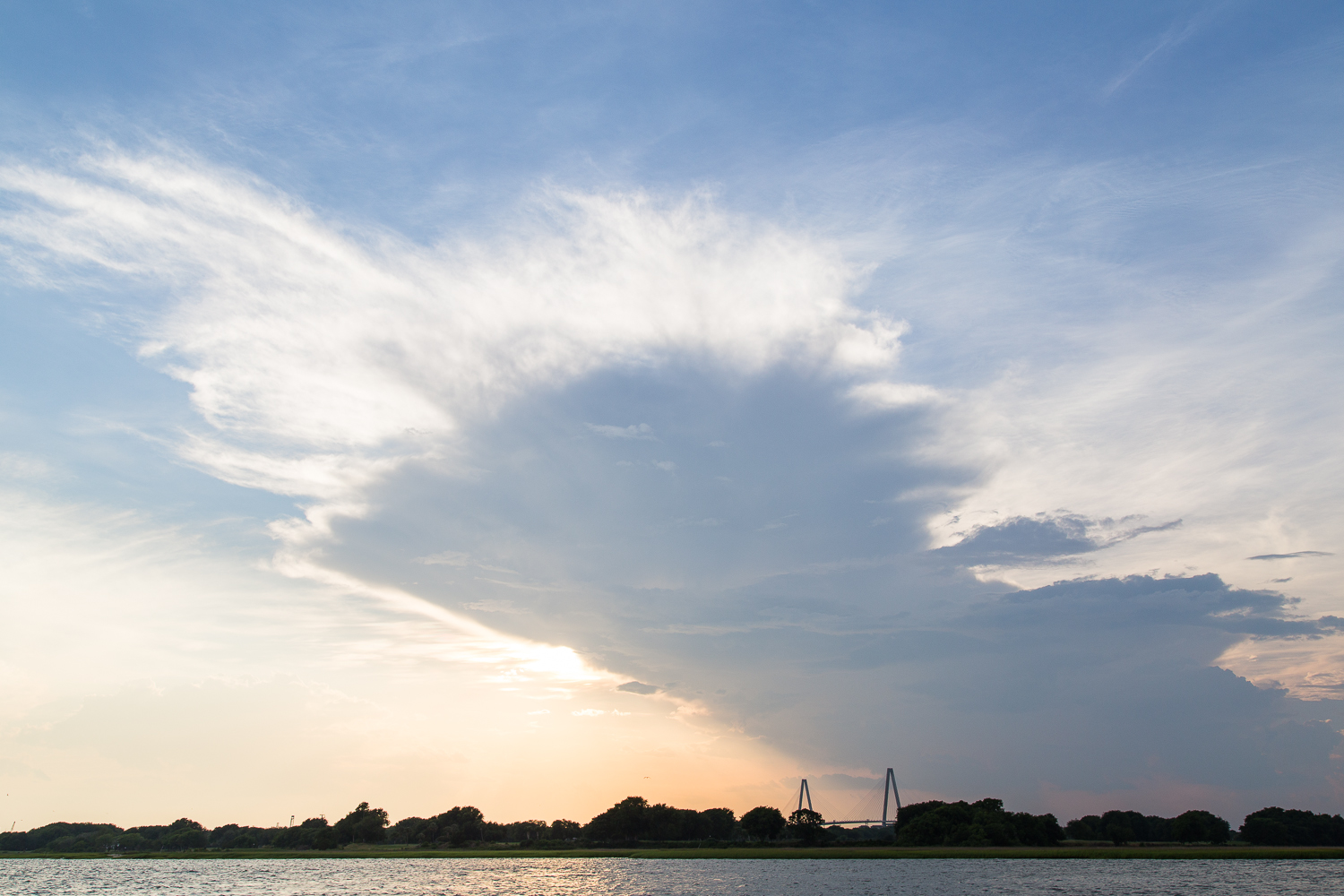 The view of the Ravenel Bridge from Shem Creek is obstructed, though the storm cloud — or, rather, its benign cousin — that chased us off Lake Marion earlier made for an interesting foreground nonetheless.