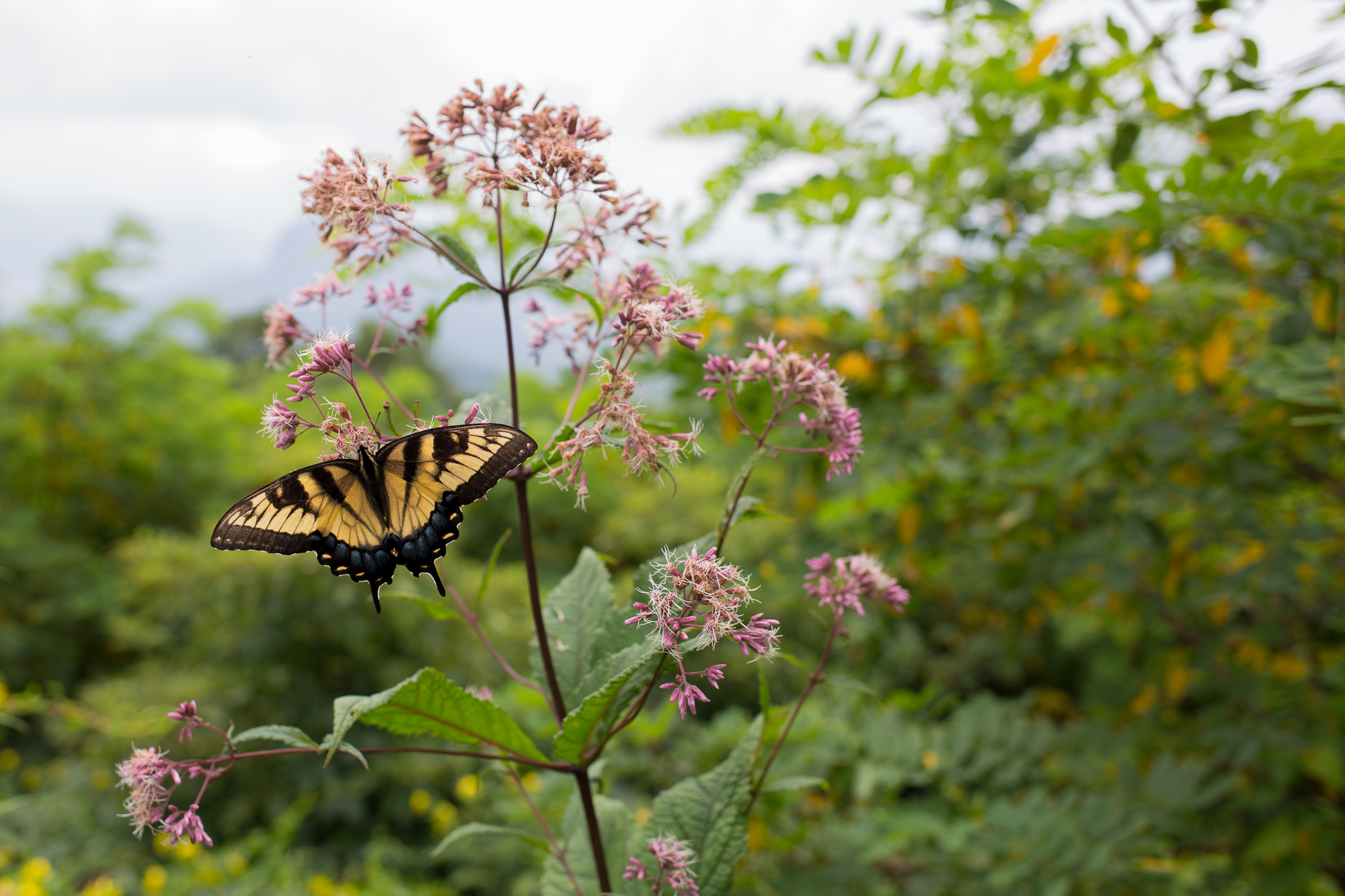 The weather wasn’t quite as optimistic on Sunday, so I drove lazily on the Parkway and stopped at several overlooks. It’s impossible to escape from insects, even at the high elevations on the Parkway outside of Asheville, but here the tables turned as a butterfly paused to soak up the view.