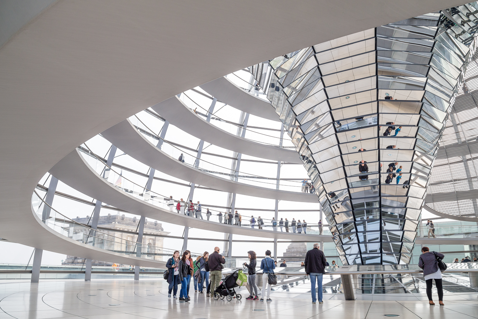 A trip to the Brandenburger Tor wouldn’t be complete without a visit to the Reichstag, which is open daily and freely to visitors (reservation required). The cupola at the top of the building, completely destroyed in WWII, is the main attraction, though when the Bundestag is not in session the Plenary Chamber is also viewable from a visitor’s gallery. Unfortunately, I missed recess by a few days and was able only to see the cupola, where hundreds of mirrors direct light into the glass roof of the plenary chamber. The architecture and engineering of the cupola is a pretty incredible achievement, as the center column is not just for light and decoration but also for air handling and building heat recuperation.