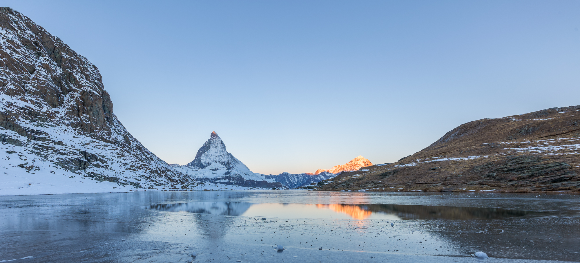 This weekend ended up being largely about the Riffelsee. In 2011, almost down to the same weekend, I had also attempted to hike to the lake for sunrise. That time, I got lost. This time, I got up at 2:30 AM to give myself plenty of time to get lost and unlost. Nevertheless, even though the time of year was the same, the temperature and previous snowfall was far from: the trail was closed (I ignored the barrier and continued up the trail anyhow), and after 2100 m altitude without crampons the steep, icy uphill before Riffelalp became impassable. Rather than risk slipping in the dark, I turned around, frustrated, and headed back to the village. On a whim, I decided begrudgingly to contribute to Zermatt’s revenue by taking the train up to the Rotenboden station, about 600 m from the Riffelsee. The first train of the day this late in the season meant I would have just enough time to catch the sunrise at the lake.