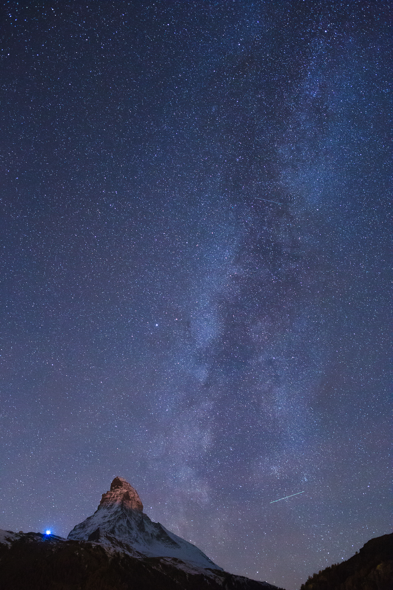 The new moon was that week, and as it rose it cast a faint red glow on the Matterhorn. Milky Way – Matterhorn shot done, this time, but not quite the composition I had in mind. (After all, the Earth does spin!) The list of photos I want to take for next summer is growing…