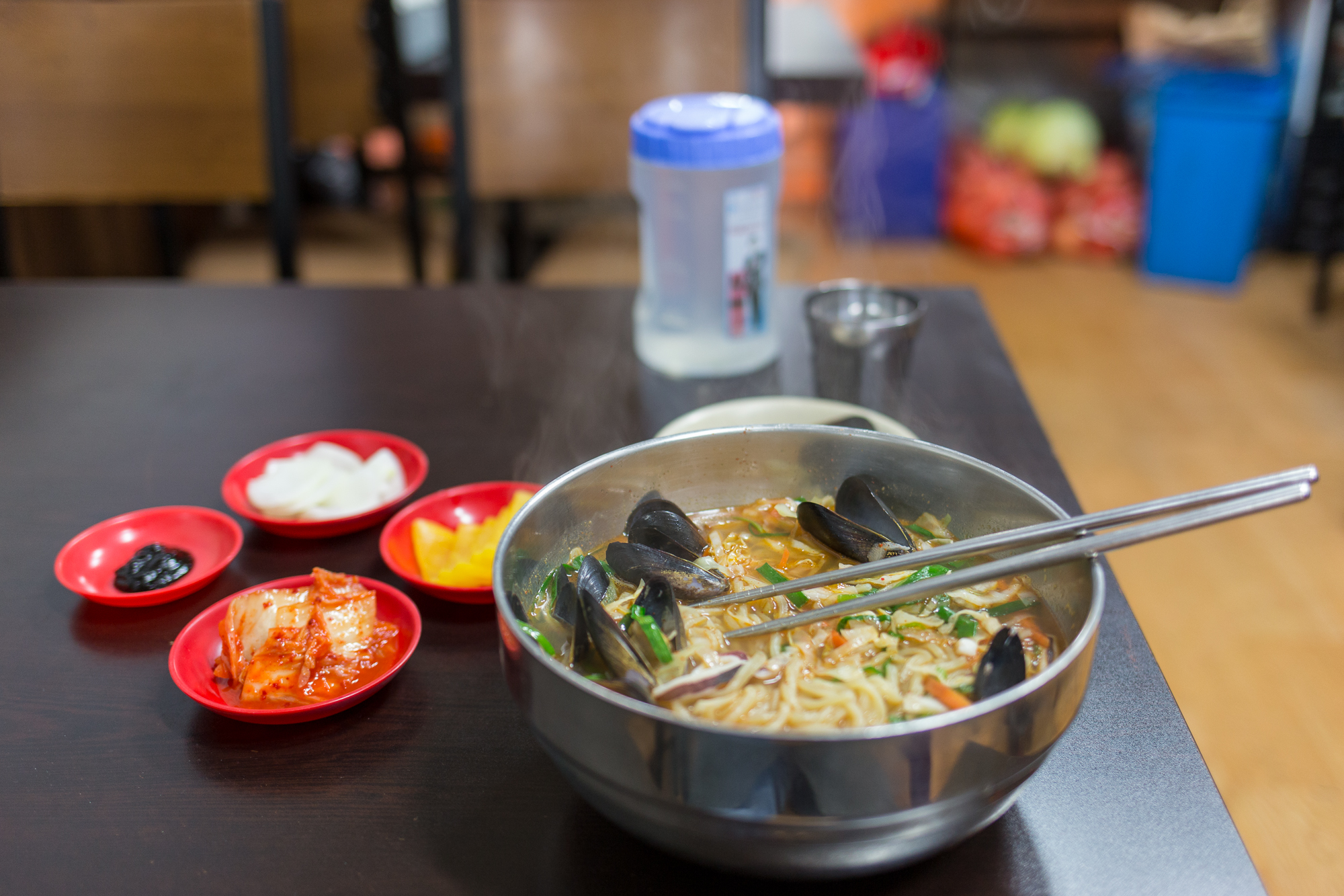 I’ve found that for me, morning hikes are more enjoyable after breakfast. This one wasn’t difficult — maybe only 300 vertical meters — but I wasn’t sure what to eat that morning. Normally I’d have a sandwich or cereal before I left, but as my goal was to explore I walked around a small market near the apartment and stopped in a tiny shop off the side of the main road. Unable to read Hangul, and the owner unable to speak English, I pointed at an item on the menu. It turned out delicious!