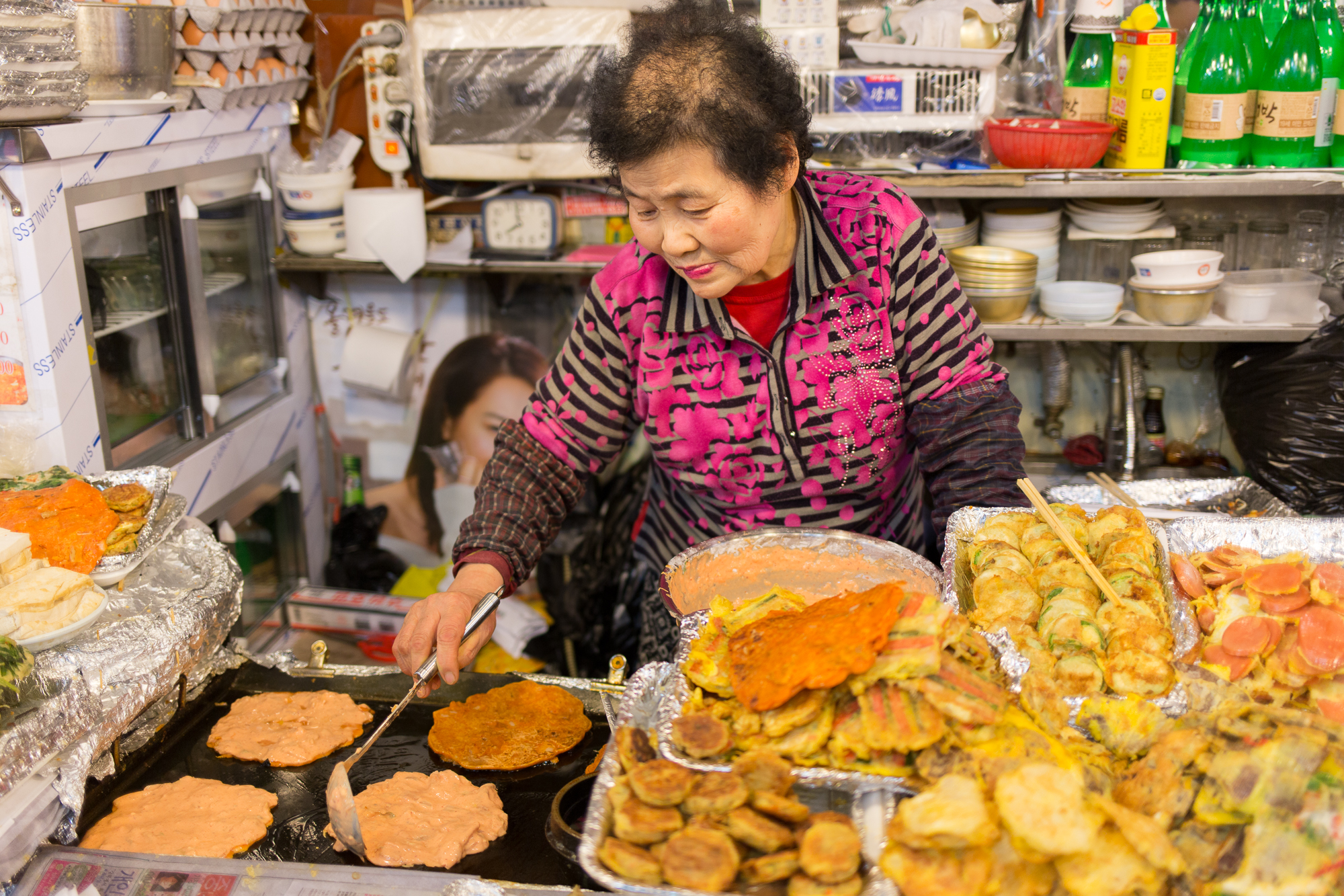 That night, I ventured into the city for a meal and chose the Gwangjang Market. Not knowing what the foods were, I sat down at a stand and ordered what was probably two or three pounds of Jeon. (Somehow, despite walking around the market twice before sitting, I missed stalls that had other foods.) It was good, naturally, but little did I know that this is usually an appetizer, eaten while drinking [presumably heavily], or as a side dish. Instead, I made it my main course, lack of language skills scoring a point. More important: I wish I could have spoken to the cook. She has been doing this for many years; a magazine cover that hung behind her right shoulder from the 1990s has her proudly offering up one of her specialities.
