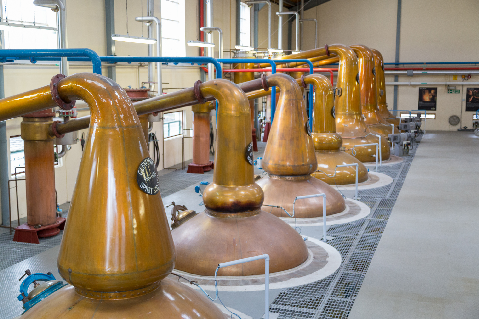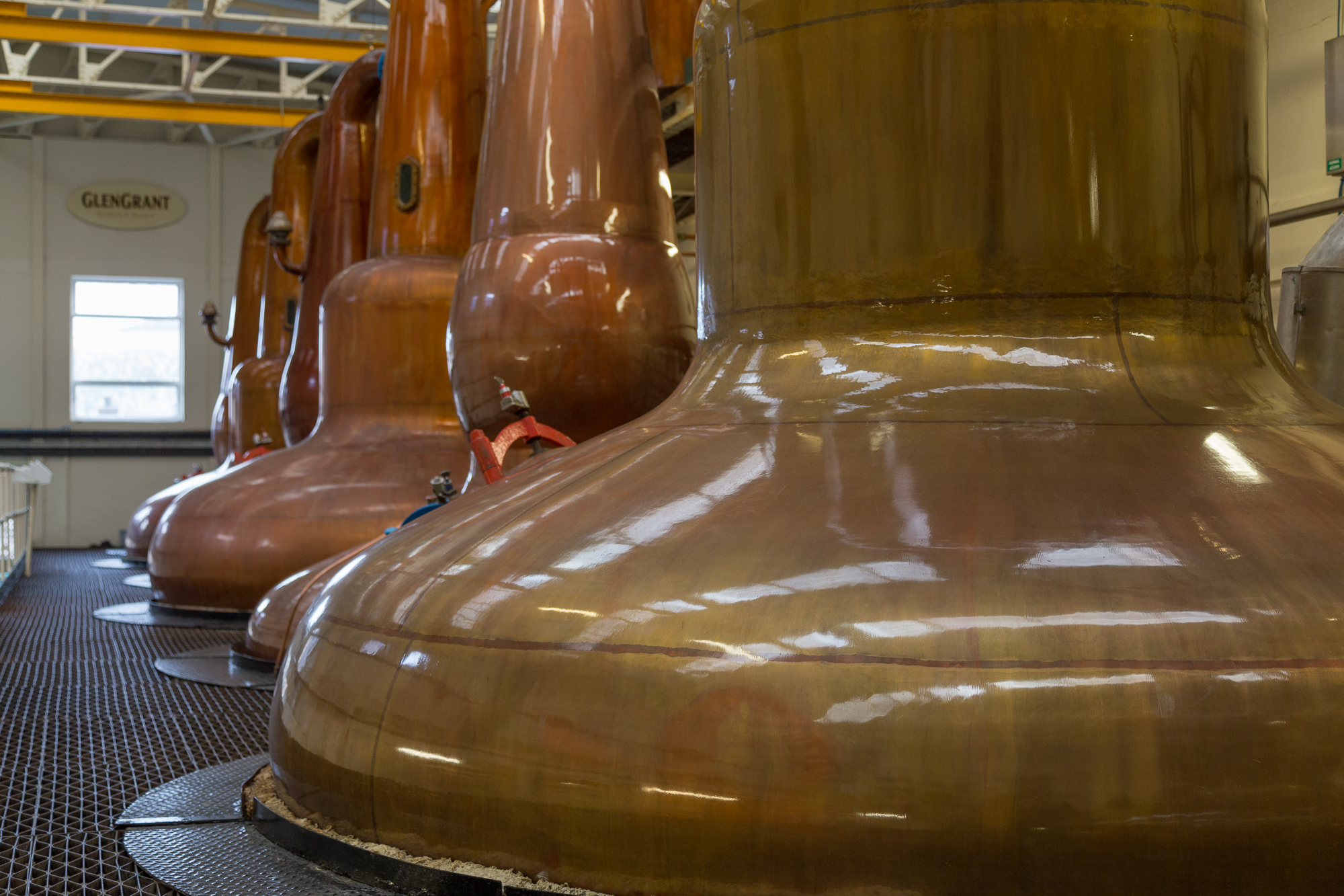 Landscape photography turned out to be challenging, but the distillery tours were an educational introduction to whisky production. Until recently, I hadn’t really tried Scotch whisky (I’ll refer to it simply as “whisky” from now on out) and therefore the idea of visiting a distillery, much less multiple, had not been on my mind in the past. However, as a friend introduced me first to a Speyside and as I grew quite fond of a certain Islay (pronounced “eye-lah”) whisky the number of possible distilleries to visit while in their namesake country suddenly seemed daunting. My friend’s trainee rotation — one station in the same program I had done in 2011 — coincided conveniently with my time in Germany, so Scotland as a destination with an occasional focus on distilleries emerged and strengthened as an idea. The first, Glenfiddich, was arguably the most seamless. Our tour guide (Lorna) was knowledgable about the process and about Glenfiddich, and the tour was rather unique in its showing the entire process from milling to maturation. Photography was also allowed in nearly all areas; by contrast, Aberlour, Lagavulin, and Talisker were not so forthcoming with picture-making. The reason given, including at non-photography areas of Glenfiddich, was typically “volatile vapors.” Glenfiddich is the best-selling single malt (which today means only that the whisky comes from one distillery, not that it was matured in one barrel) Scotch whisky and the number of pot stills in the stillhouse reflected that status: its two stillhouses seat somewhere around thirty pot stills.