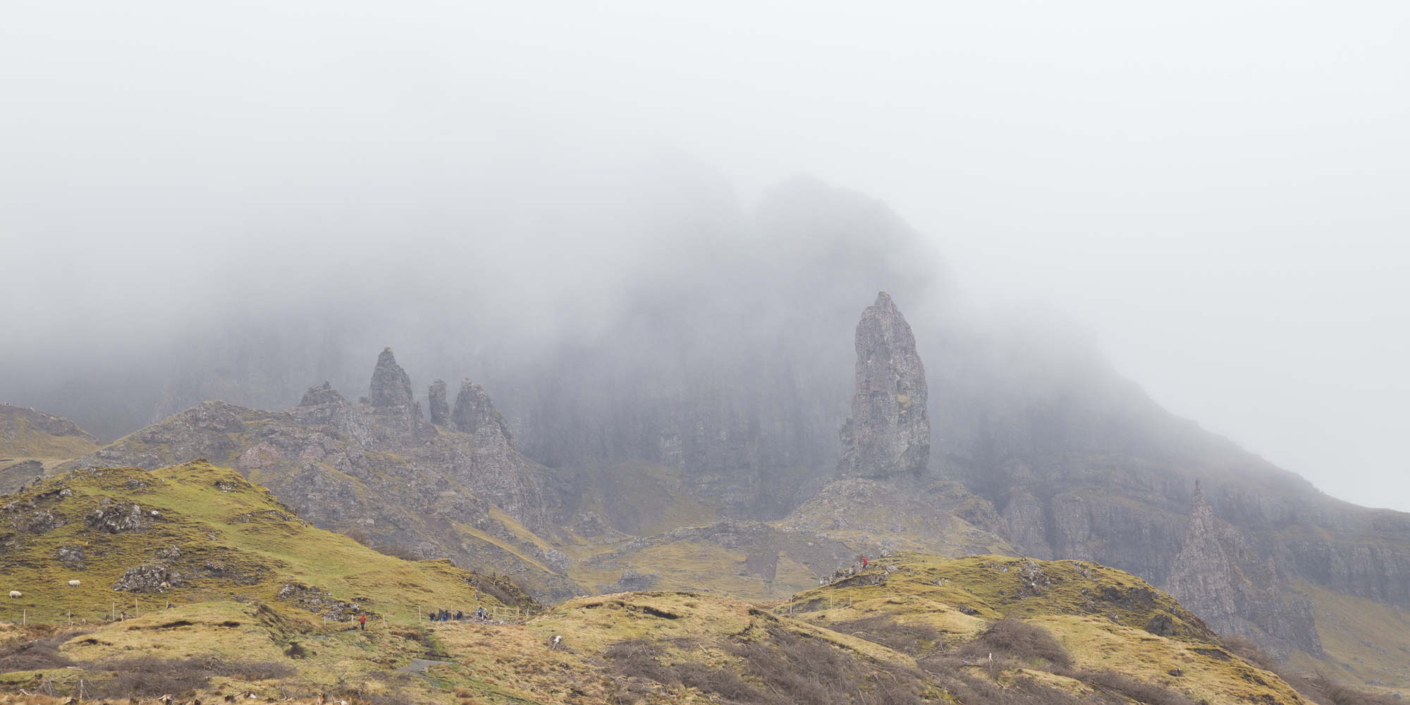 The next days, the rain came and went. Half of our trip was spent on the Isle of Skye, an impossibly dazzling island landscape of high mountains, flat valleys, cliffs to the sea, and sheep. When we left the Highlands for Skye, weather conditions were favorable but gradually deteriorated, changing to a constant rain by afternoon and continuing into evening. Driving in Scotland takes far longer than the distances would indicate between singletrack roads (i.e. one-lane roads with pullouts every few hundred feet to allow for passing), sheep, and incredible sights, but with the incessant rain we rarely stopped for photography. In between downpours we ran up toward the Old Man of Storr, which may be familiar due to its being the background in Prometheus, but stopped short of continuing to a distant summit for the uncertainty of and aversion toward getting soaked were the skies to reopen — a good choice, as it turns out, as reopen they did about two minutes away from the car.
