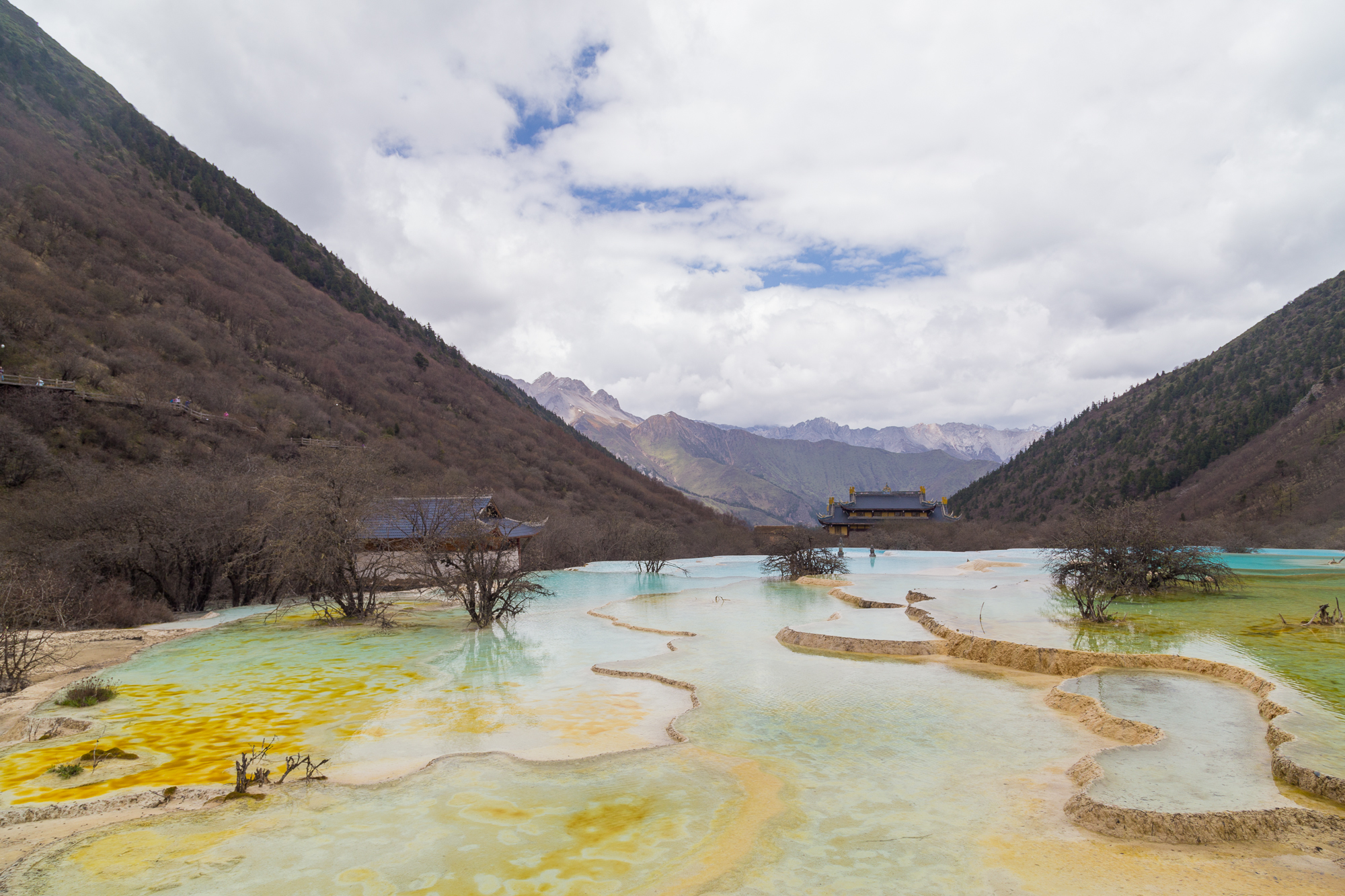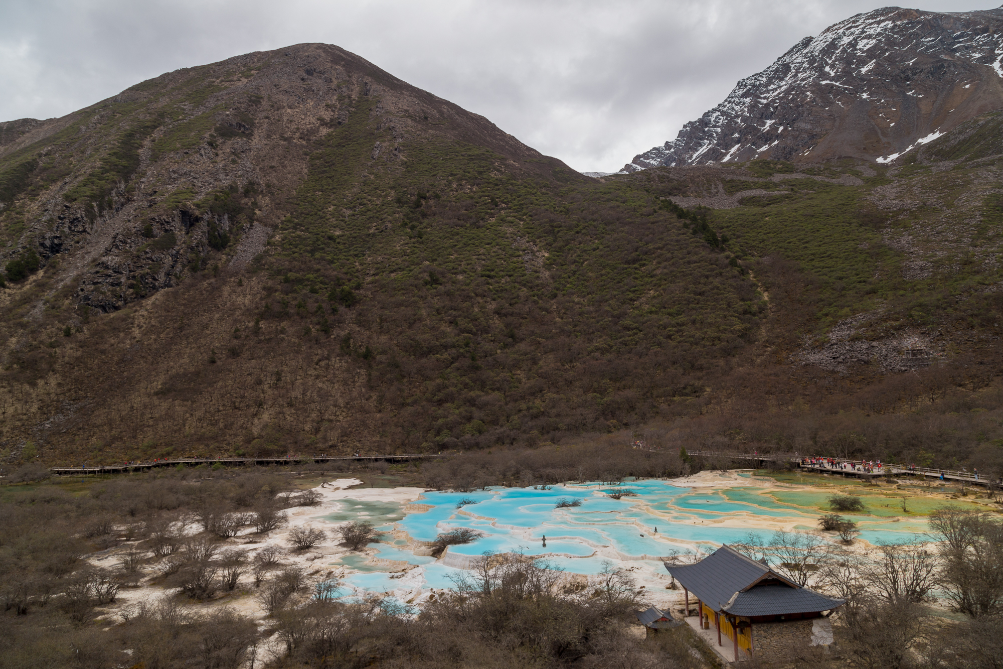 Not far from Jiuzhaigou, and the other half of the name of the Jiuzhai-Huanglong Airport, is Huanglong (黄龙; literally, “yellow dragon”), itself a 5-A rated tourist attraction. Unlike at Jiuzhaigou, there are few waterfalls here. The area has its fame due to multiple colorful pools, shaped over thousands of years. Here also was low season, with multiple signs indicating that what were now dry pools would be overflowing come July rains. The entire route from entrance to the highest pool is walkable on a ten foot wide boardwalk rather than gravel or earth trail, rendering what would otherwise be a Yellowstone-like ruggedness slightly cheesy, as if the area were on display only to attract touristic revenue than promote appreciation of natural beauty. Such finished surfaces are, however, the norm with tourist attractions in China.
