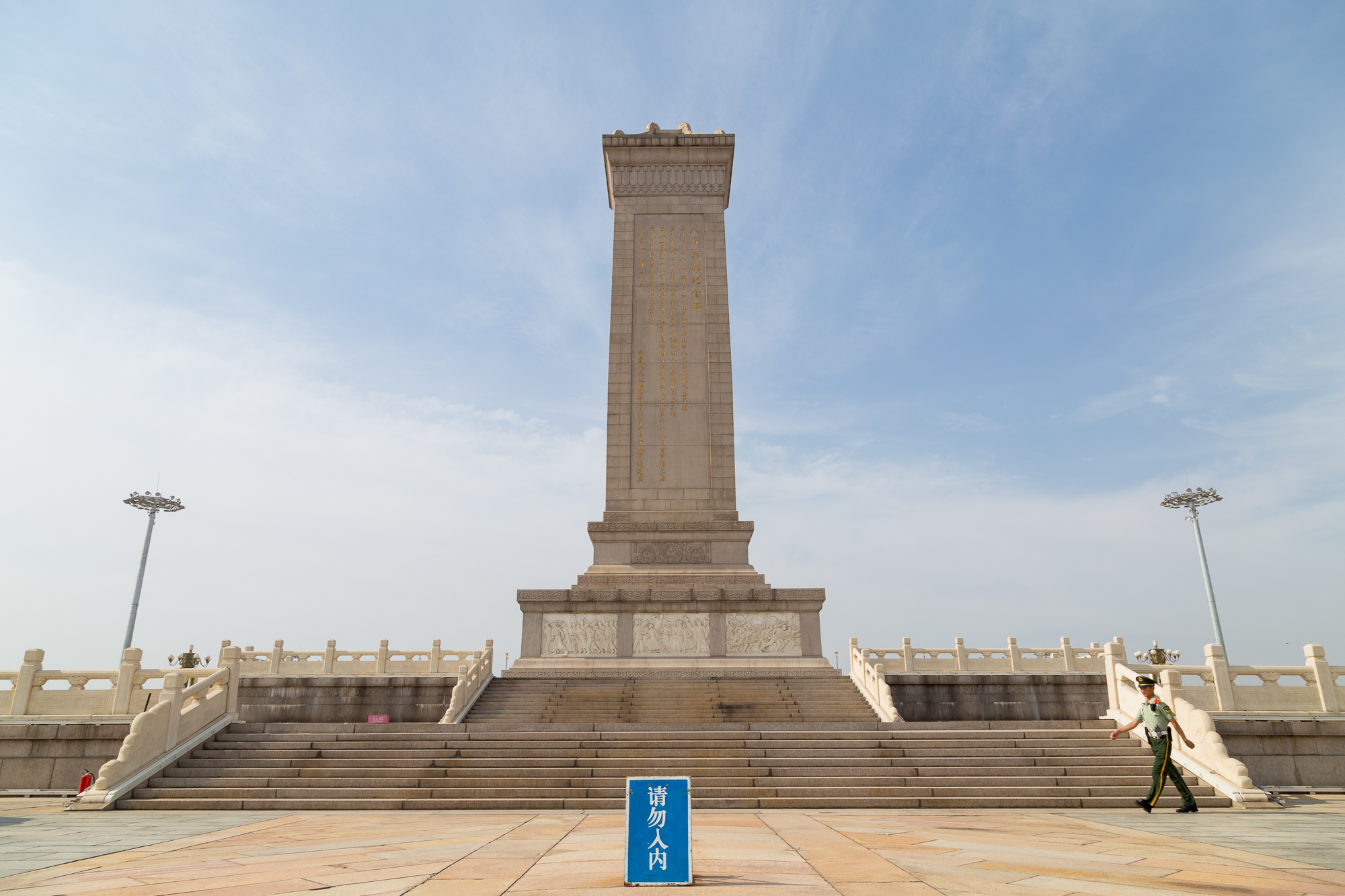 The Tiananmen Square (天安门广场) will likely always carry a bit of infamous connotation in protests located there on June 4, 1989, but the afternoon we had a look at the Monument to the People’s Heroes (人民英雄纪念碑, or Renming Yingxiong Jinianbei as pinyin) the square was quite empty; a sole police officer and dozens of cameras I’m sure kept a close watch.