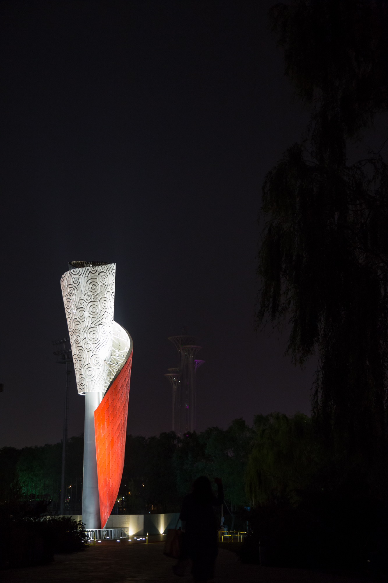 The Olympic torch sculpture, for which I saw and know of no translation, was, however, lit, and brightly enough at that to make pushing the shadows of the willow trees next to it and Olympic Park Observation Tower (奥林匹克公园瞭望塔) behind it difficult.