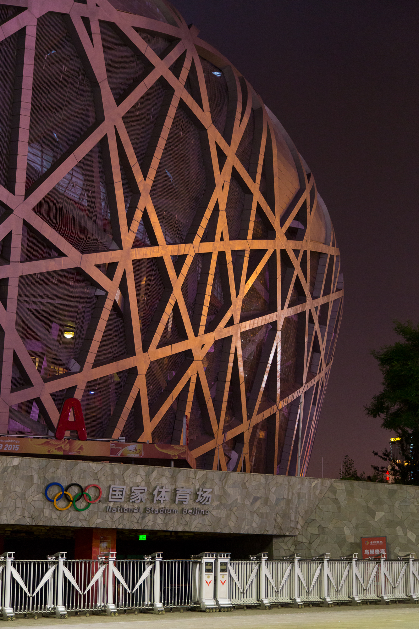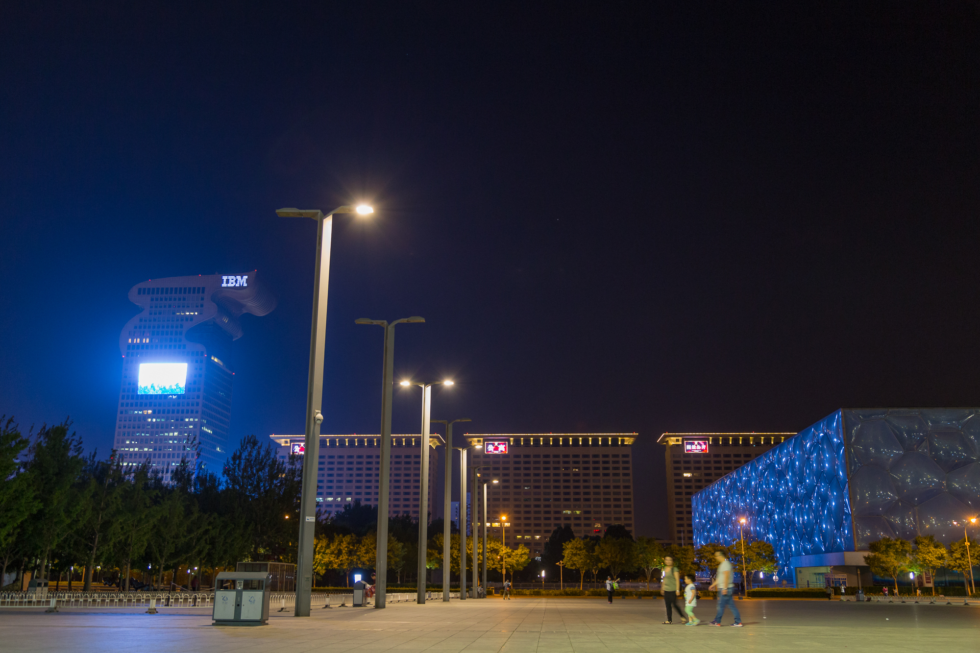 That night, after a dinner at Quanjude for roast duck, we headed up to the Bird’s Nest area to see the facility at night. Its square, too, was desolated, with just a few teenagers riding skateboards and families doing their nightly walk. The Bird’s Nest itself — official name National Stadium, or 国家体育场 — wasn’t lit as spectacularly as I had hoped, but without a tripod the quest wasn’t bound to be anything enlightening (pun intended).