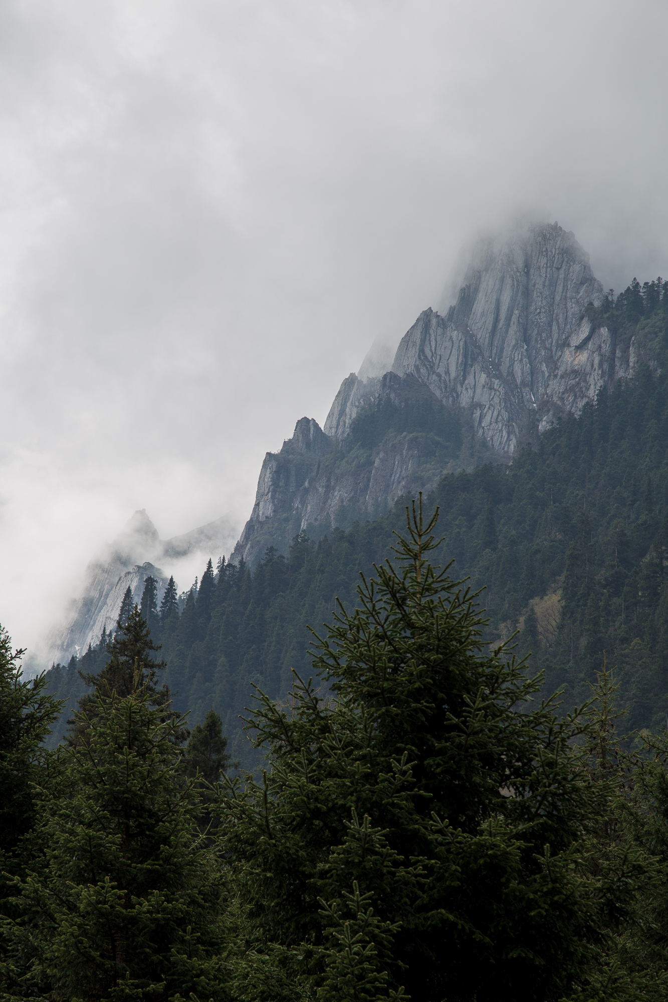 The area is, with the right timing, spectacularly beautiful. The deep valleys are strewn across the Min Mountains and on the edge of the Tibetan Plateau, so remote from other cities in Sichaun (often anglicized as Szechuan) province that the entire area was nearly inaccessible until the 1980s. To preserve its pristine air and manage the hordes, buses run constantly, picking tourists up and dropping them off at the next stop. As often as the buses come, there is no respect for lines or queueing. Our first day was cloudy, but a brief clearing in the morning showed just how tall some of the mountains nearby were: where I was standing when I took the picture was around 3,000 m above sea level.
