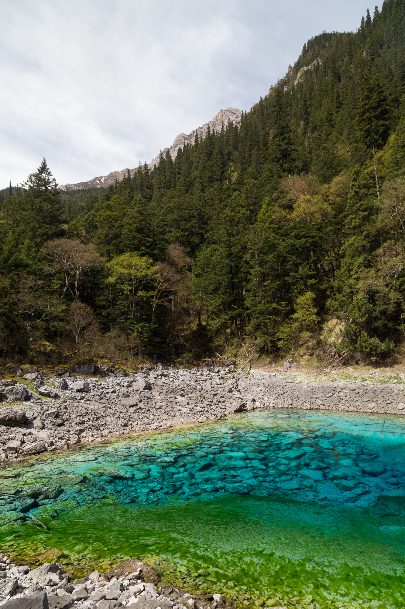 The mountains nearby were not the primary focus of the nature reserve, however. The star of the show would be the water: incredibly clear, blue as the sky, ice-cold water that sat in colorful pools that lay at the base of the mountains. The low water level here at Five Colored Pool (五彩池, Wucaichi) was indicative of the low-rainfall season, though this did not stop visitors from streaming onto buses and the boardwalk surrounding the pool.