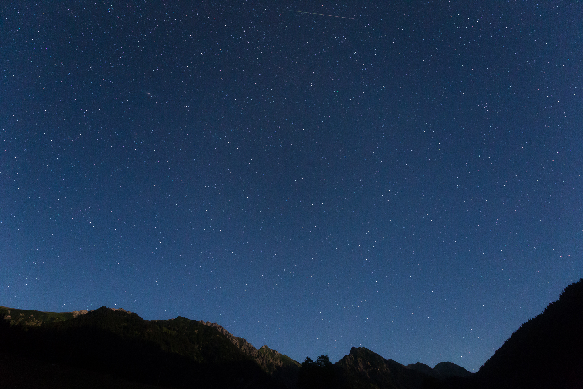 Last weekend was a long weekend in Bavaria, honoring in particular the Assumption of Mary. Plans for an ascent of a 4000er falling through, I decided to use the weekend to catch up on photos, sleep, hang out at the Allgäuer Festwoche, and do some light hiking. It also happened to be terrific weather for the Perseids, and on Saturday night I spent a couple hours in Hinterstein, miles away from light pollution. I could hear the faint, intermittent tinkling of cowbells when I left the car, but was a little disappointed to see how bright the moon was: the summits of the mountains to my east were fully lit, and the Milky Way was only a faint glow in the sky.