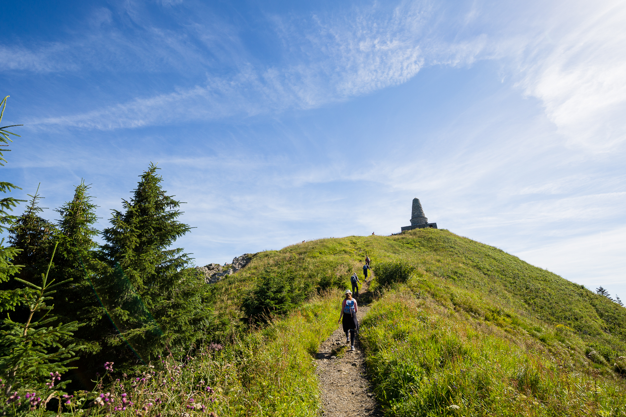 From the southwest trails, the War Memorial at the top of the Grünten is visible soon after breaking the tree line. It was a warm day with hardly any wind, but the fresh air was delightful.