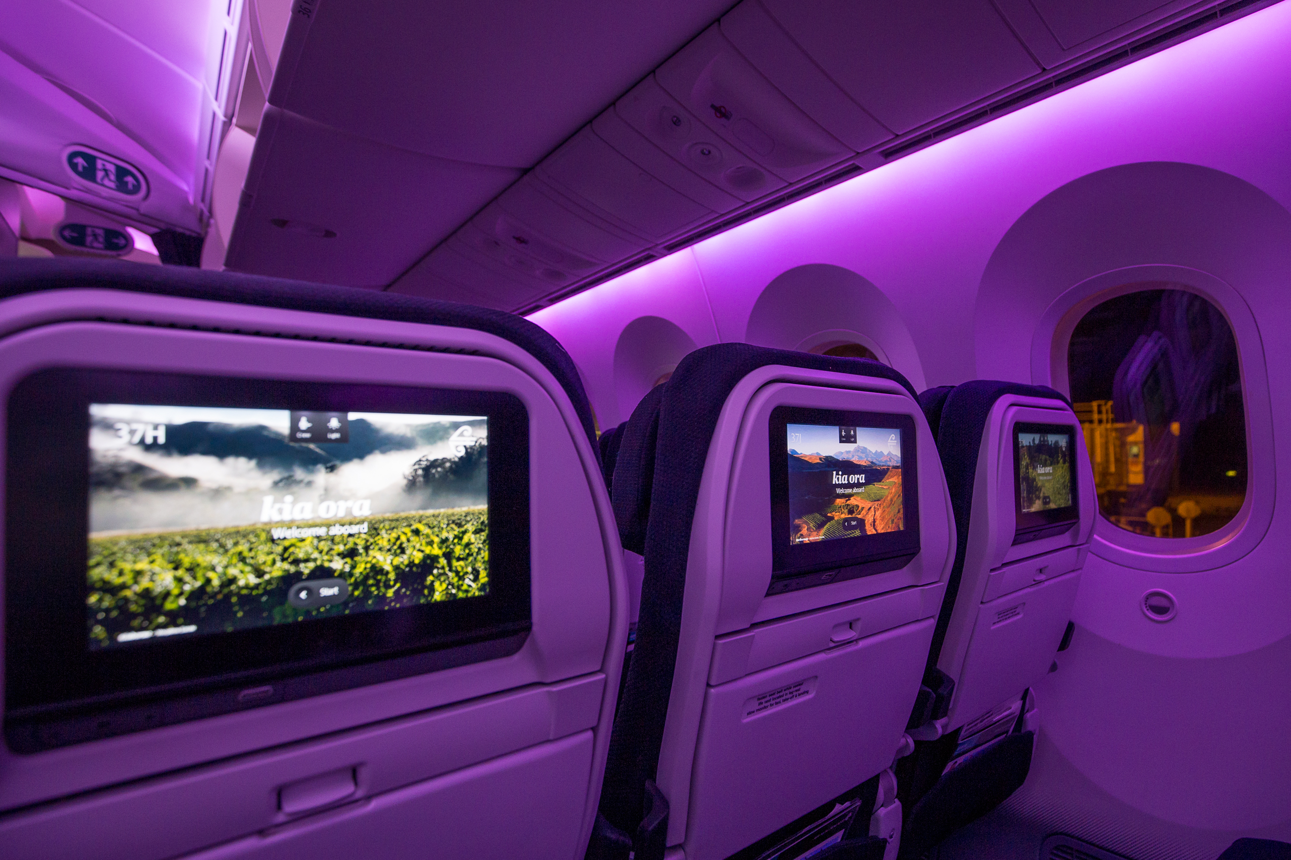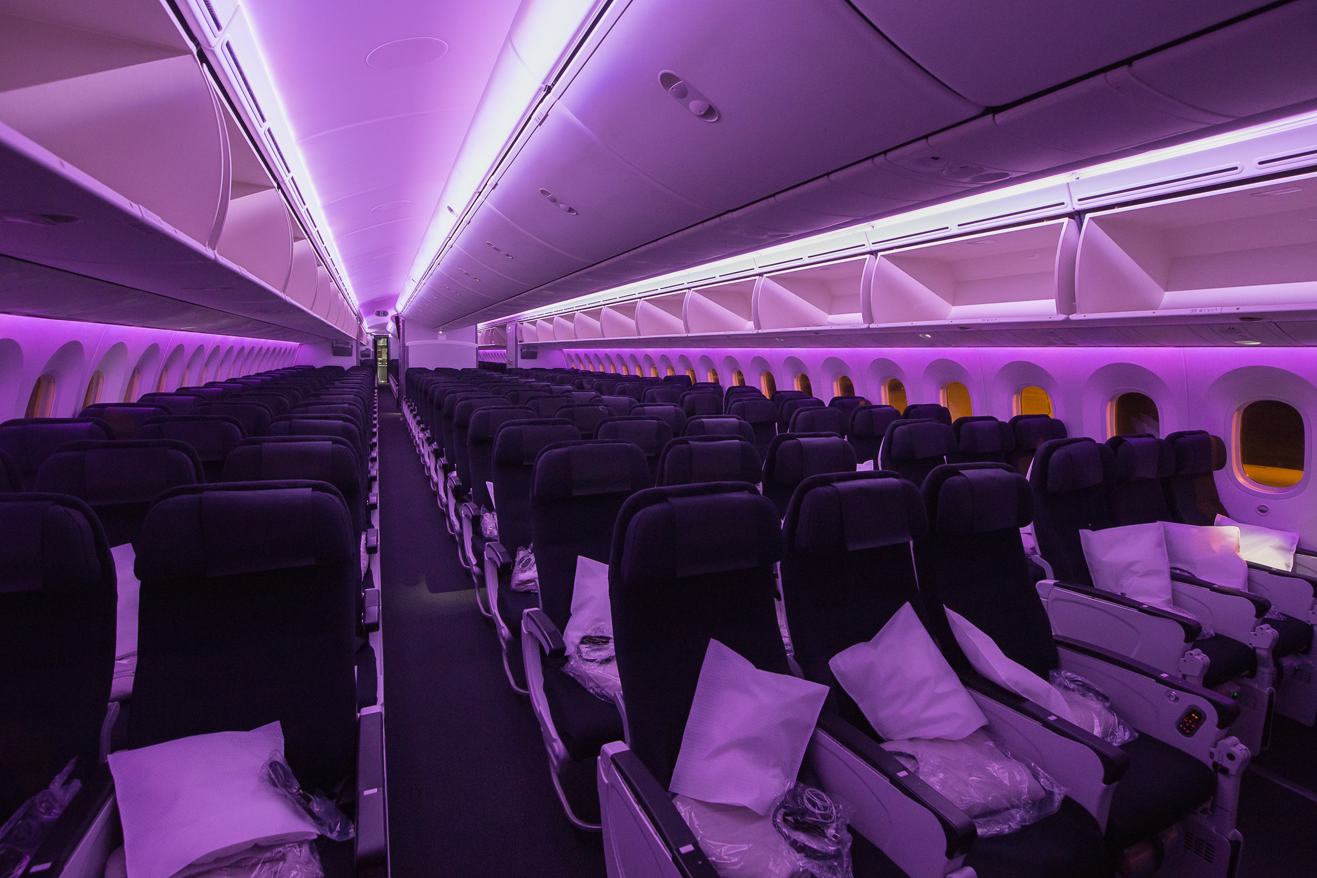 On my way to Auckland, I was one of the last to board because I inadvertently fell asleep in the Pudong lounge. Making up for the hiccup, returning to Pudong I was the first economy passenger to board and walked into a spotless Air New Zealand 787-9 aglow in bright purple lighting.