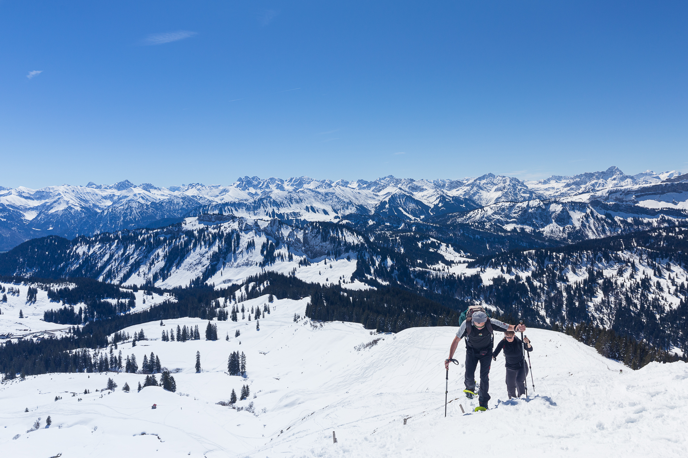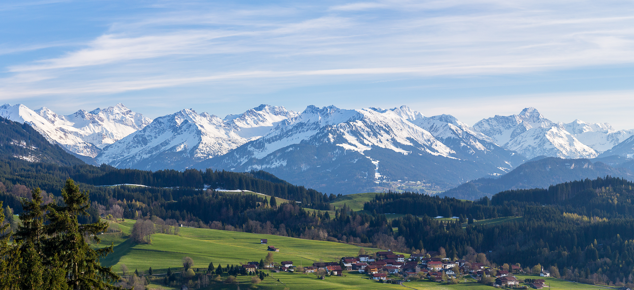 I’m not a skier, but being on the slopes with several groups of them on a truly cloud-free day in late April made me briefly consider the sense in buying a pair. The views from this mountain were outstanding — 360° views to seemingly the entire Allgäu; despite being well below 2000 m, the Riedberger Horn has no taller immediate neighbors to block views from its summit. I gleefully shot off shot after shot for panoramas later, frustratingly learning only afterwards that focusing while taking individual shorts for a stitched photo can confuse the software if the focal length changes while adjusting focus. Nevertheless, at the time, I couldn’t be bothered. I was trying not to be blinded by the bright snow, which would then cause my eye open to the viewfinder to tear up and the sunscreen around it to burn, in turn causing more tears. At any rate, this was the closest to the Swiss Alps outside of the Swiss Alps I have ever been. From Hochvogel (left protrusion) to Ifen (right protrusion), the entire Allgäuer Alpen were fully visible.