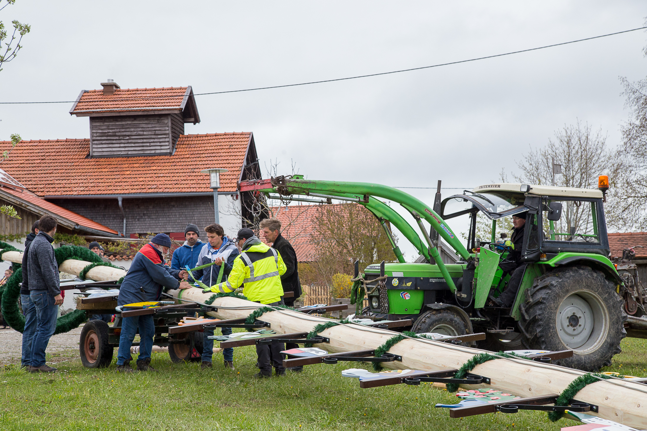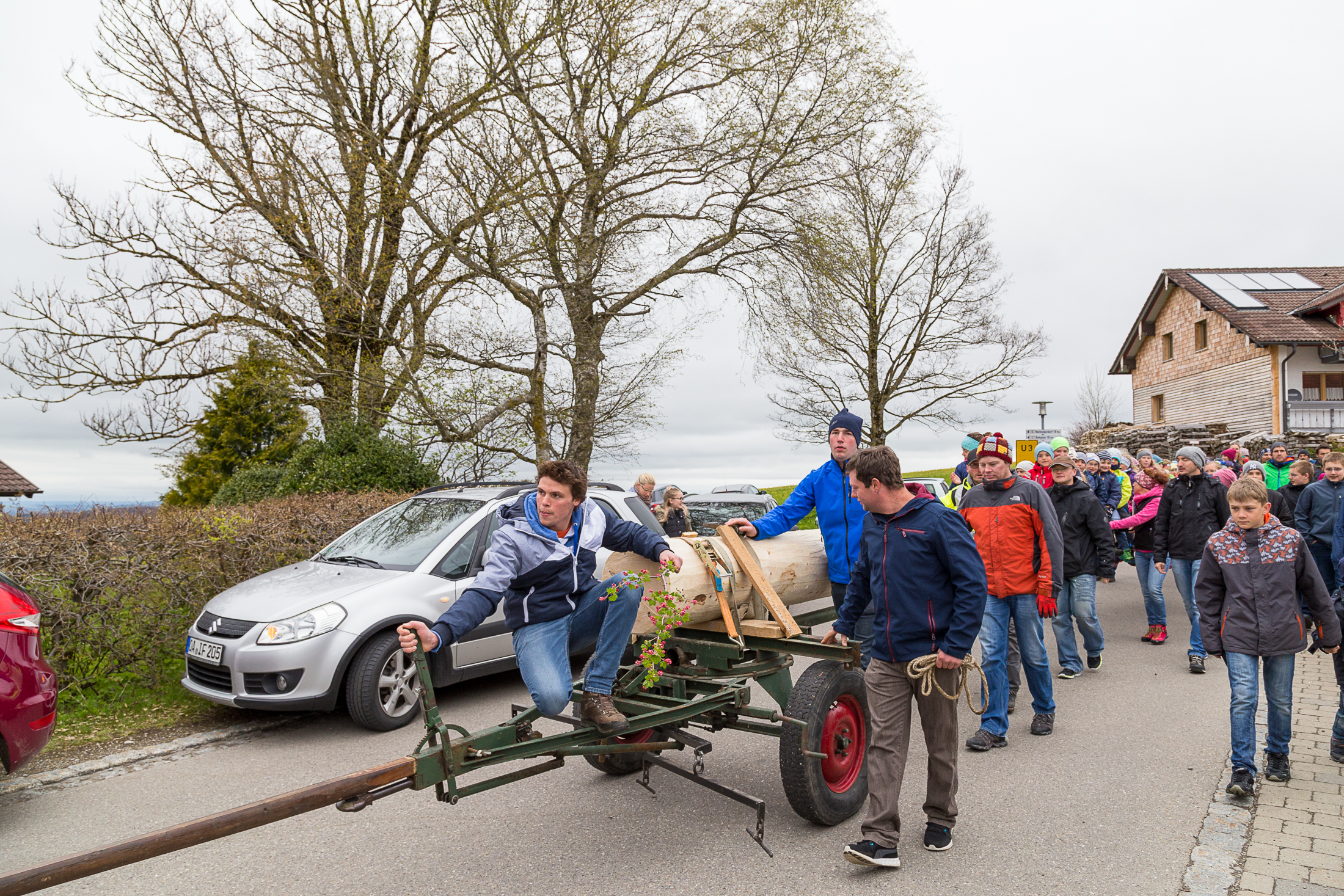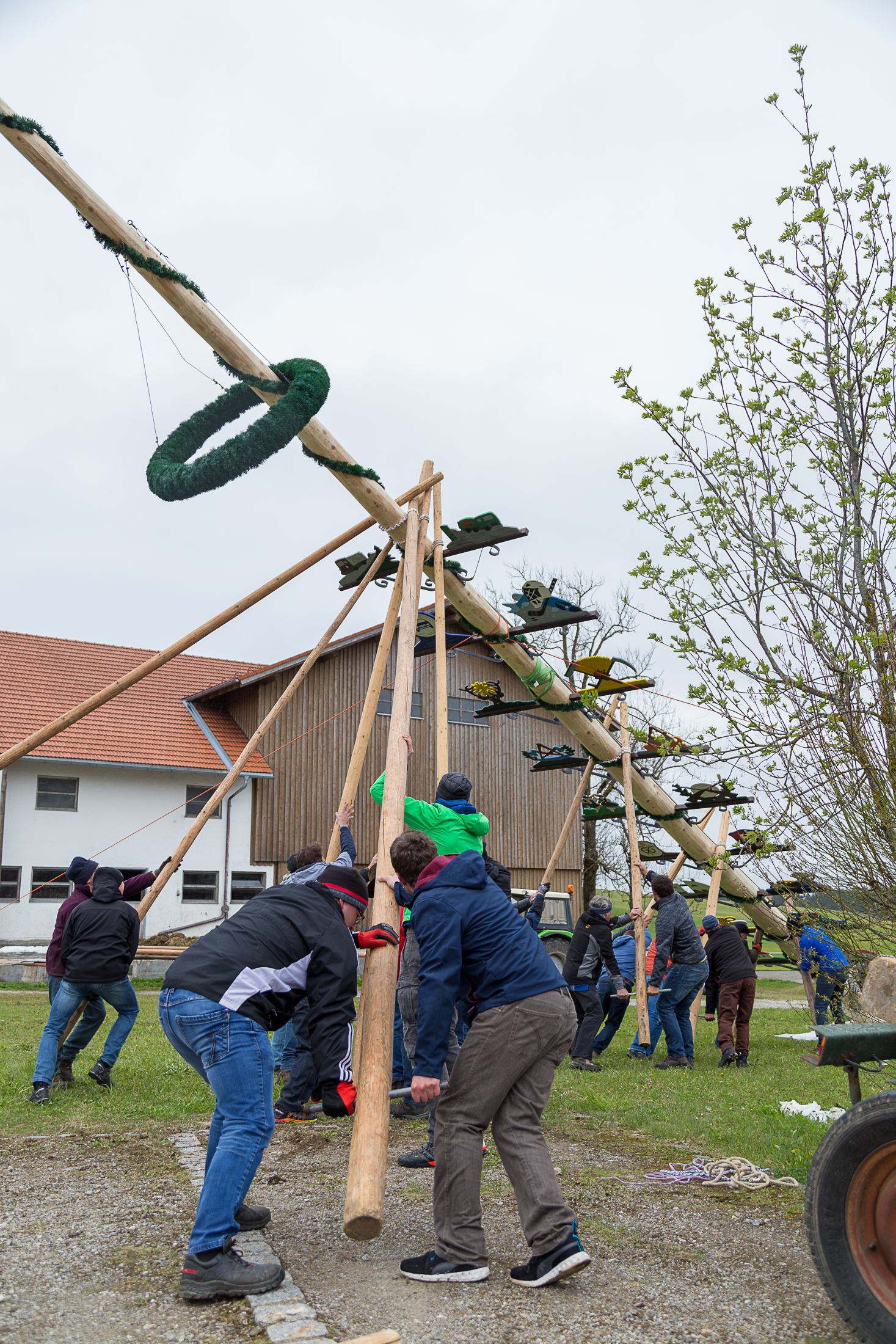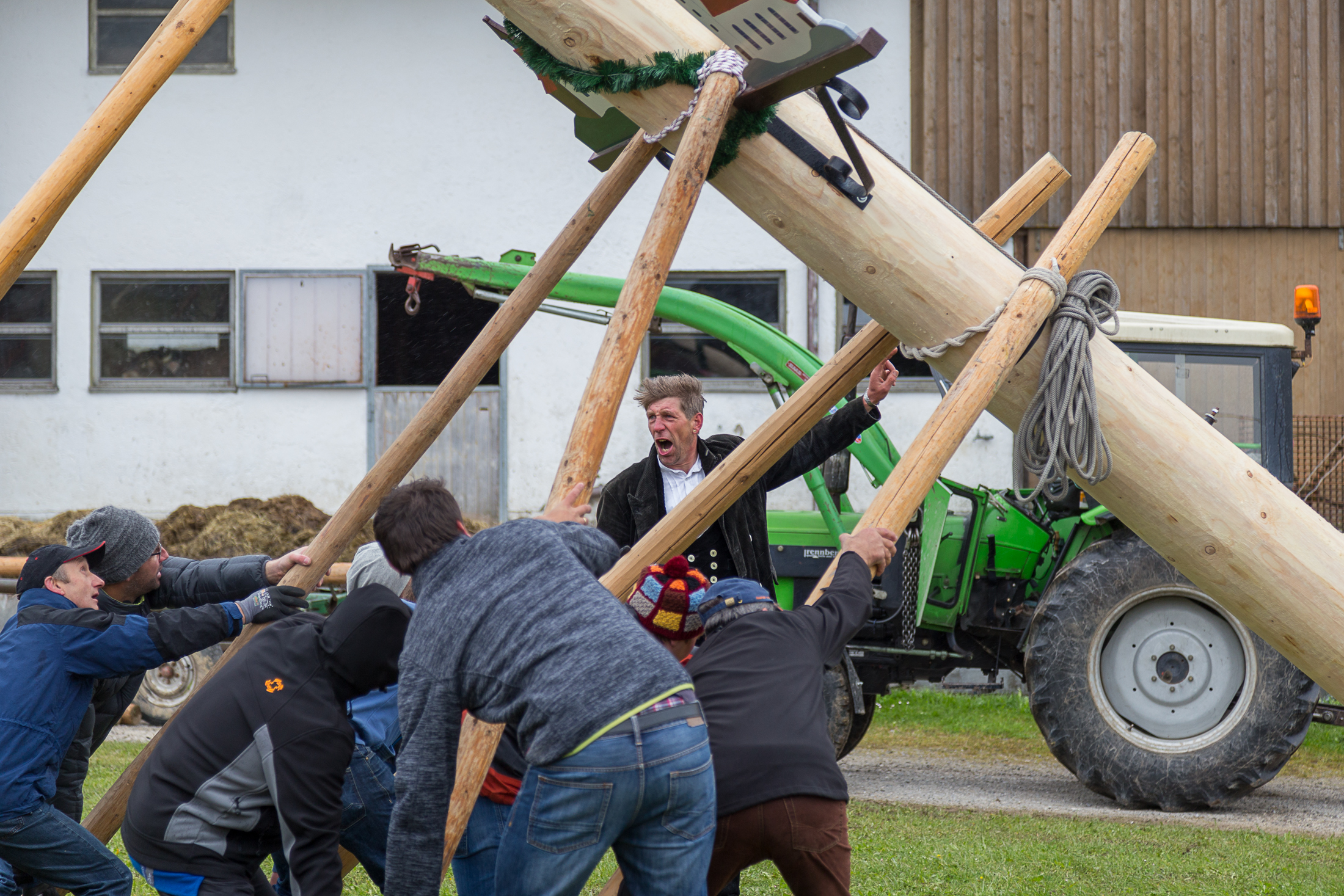 Other villages do the entire ceremony with a crane, but in Hochgreut the trunk was stood upright incrementally. The ground-end of the trunk was placed in a hinge about three feet in the ground, and on a command from the lead carpenter a group of men pushed upward until supports could be placed under the trunk to hold the trunk’s new angle. The tractor eventually also helped pull the trunk upward, and two guy lines helped maintain the attitude with the ground. It was a remarkable process, requiring significant energy and even more significant teamwork and cooperation.