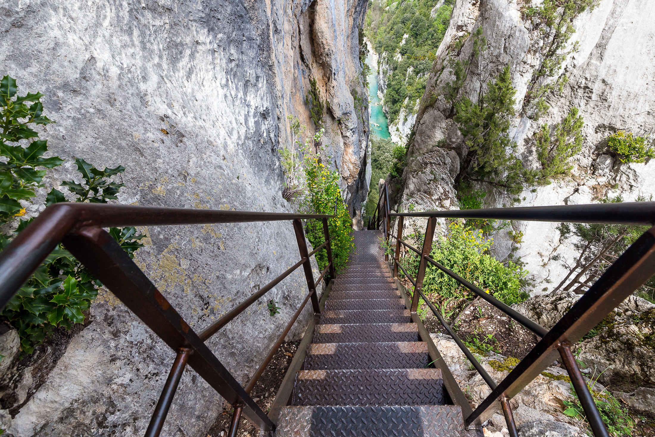 We woke up early to make it to the trailhead at Chalet de la Maline before all the crowds arrived. As the trail is 14 km one way, we took two cars, dropping off one at the end (Point Sublime) and piling into the other to start the hike. I haven’t found a definitive measure of the total elevation gain during the hike — the official hiking site of the Alpes-de-Haute-Provence states 1745 m, but I didn’t find the hike to be so exhausting. Another site shows approximately 1500 m, maybe closer to the actual figure but still deceptive as the gain is not steady upwards. The start and end points of the hikes are each about 300 m – 400 m above the Verdon river, with the trail running up and down in between. Like the Tongariro Alpine Crossing, the hike starts heading largely east before turning north, but I don’t have quite so many photos showing its majesty. Shooting in a narrow canyon with on a bright day is surprisingly difficult!