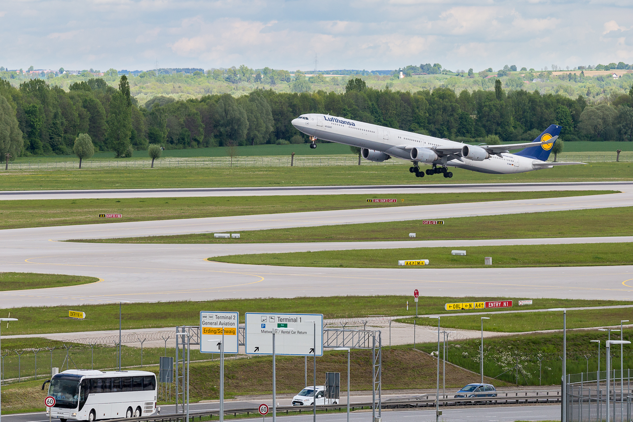 With MUC being a Lufthansa hub, it was not surprising to see so many of their jets take off. An A340-600 leapt for the skies behind the airport’s vehicle traffic, whose drivers and passengers likely oblivious that this sight is sure to become rarer as the the type is gradually replaced at MUC by the more-efficient A350. According to Lufthansa, the A350 is the first plane capable of returning a fuel consumption of under 3 L / 100 km. For a plane that carries hundreds of passengers and tons of cargo, this is a seriously impressive milestone.