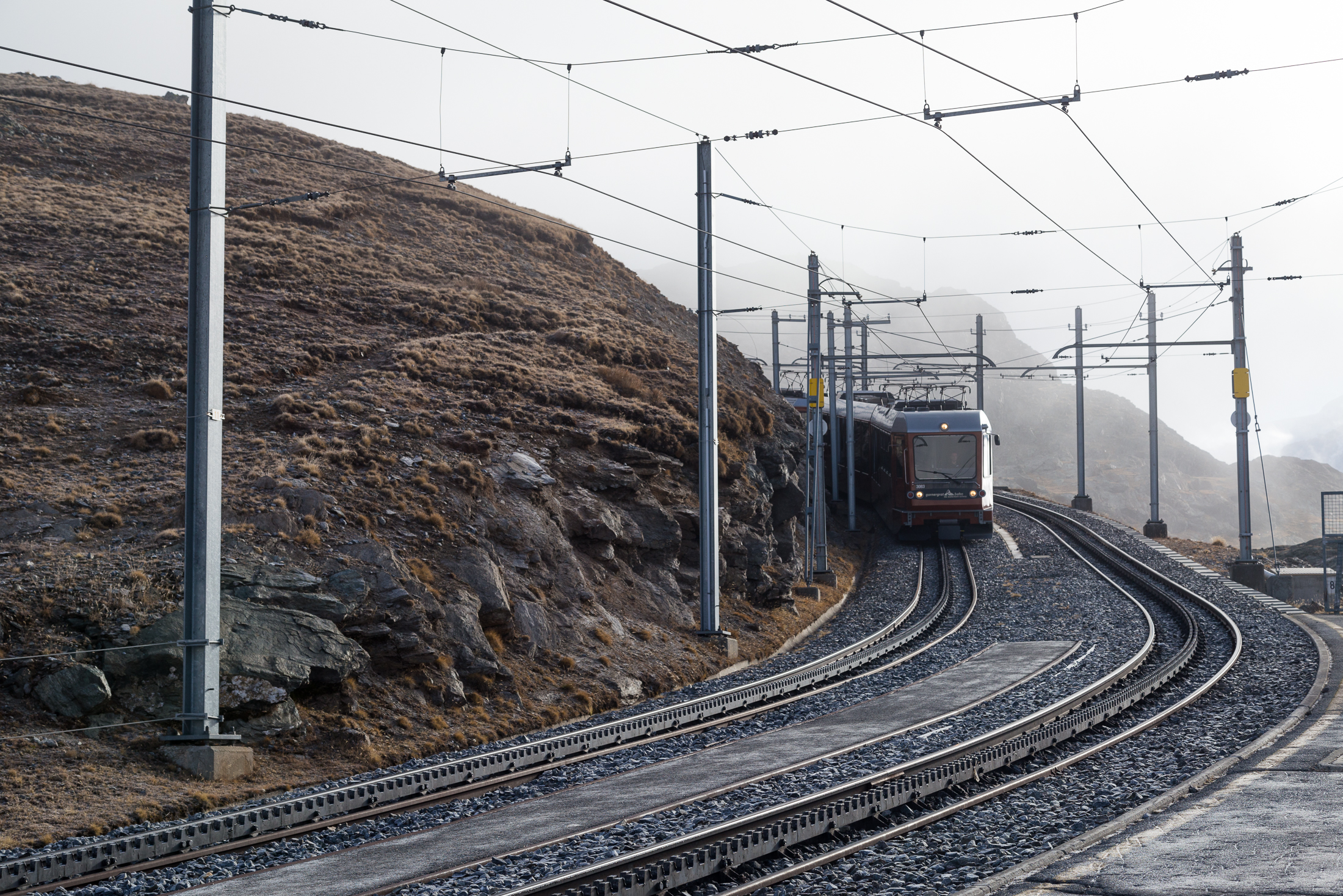 I watched two trains climb up toward Gornergrat during my fascination with the clouds and light, and grudgingly as I watched my watch tick toward noon and the approach of a third I decided it was time to head back to the village for lunch, a nap, and a return to reality. Blue skies had prevailed above the railway earlier, but clouds again blocked the view upward as I watched my train approach. The sigh of the air brakes as the train came to a stop reflected my own bemusement — so much for my panorama this time, but for a tenth time, or an eleventh, or a twelfth… or beyond, I’ll certainly be back, whether for a successful panorama or to experience this incredible breed of solitude only the Swiss Alps can convey.