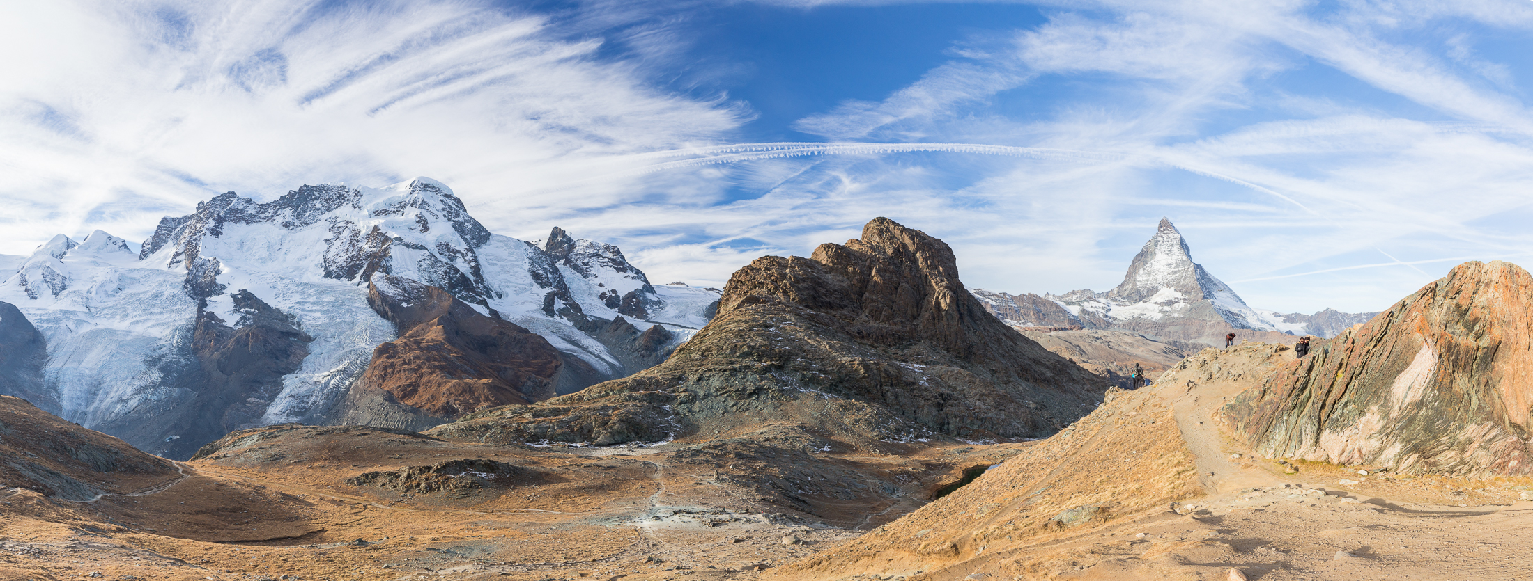 I was supposed to have been in Zermatt some weeks prior, but dubious weather as I was planning the trip made me reconsider (I ended up in Croatia instead). As it turns out, the weather played its hand anyhow, and not wanting to lose another opportunity I decided I’d take my chances before the autumn snows made the hike up unpleasantly long. After a rough summer for hiking, I needed a full three hours to get to the lake this time, up from less than 2.5 hours the summer before. Fortunately, European summer time had not yet ended, so I still could start at the “reasonable” time of 3:45 AM. Though the Monta Rose group blocked much of the early color on the Matterhorn, I waited for the sky to fully light anyhow before the trip down to Zermatt. I wrapped up my lake shooting as travelers via train began to arrive at the lake. From above the lake I shot one more panorama.
