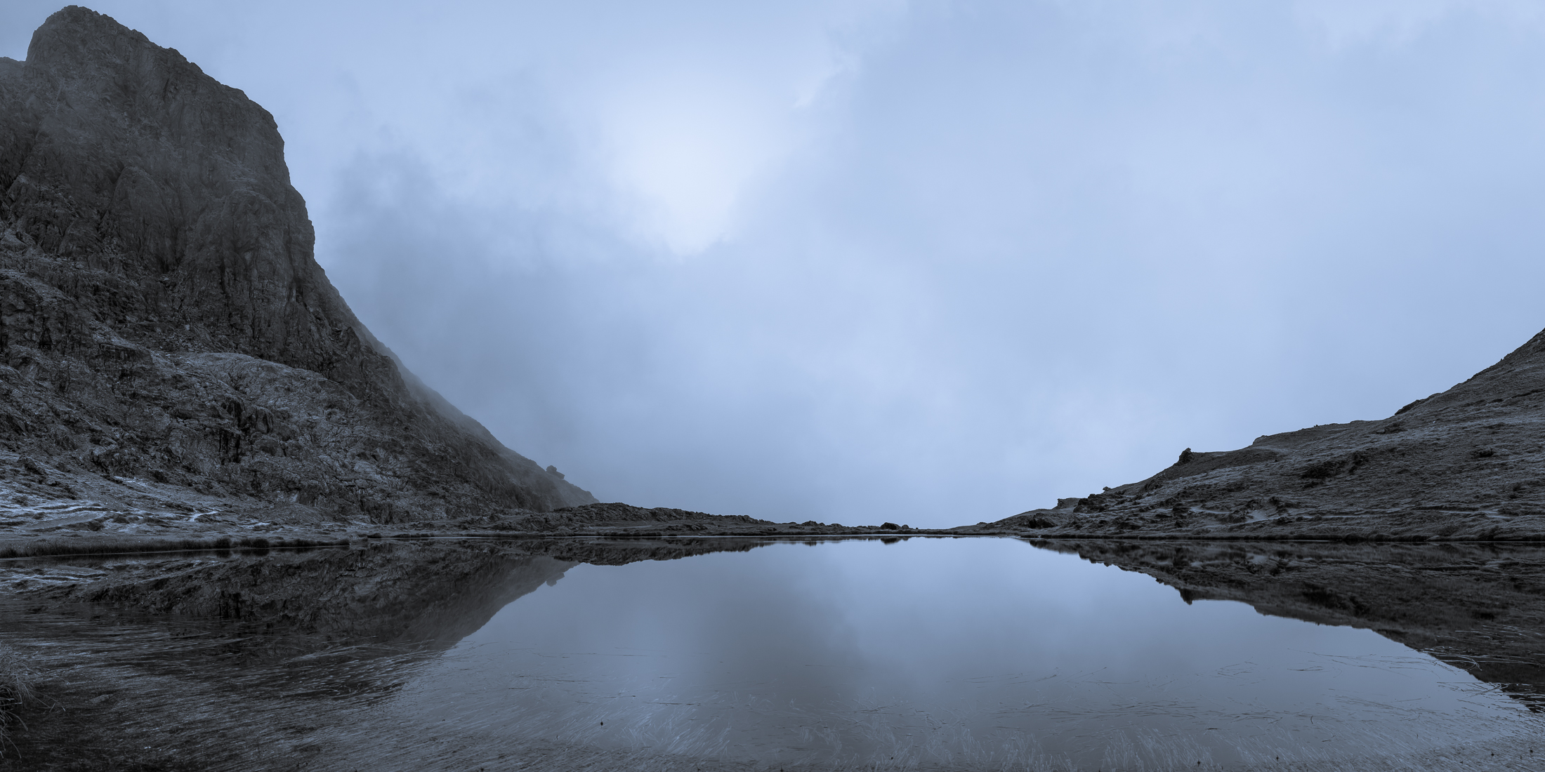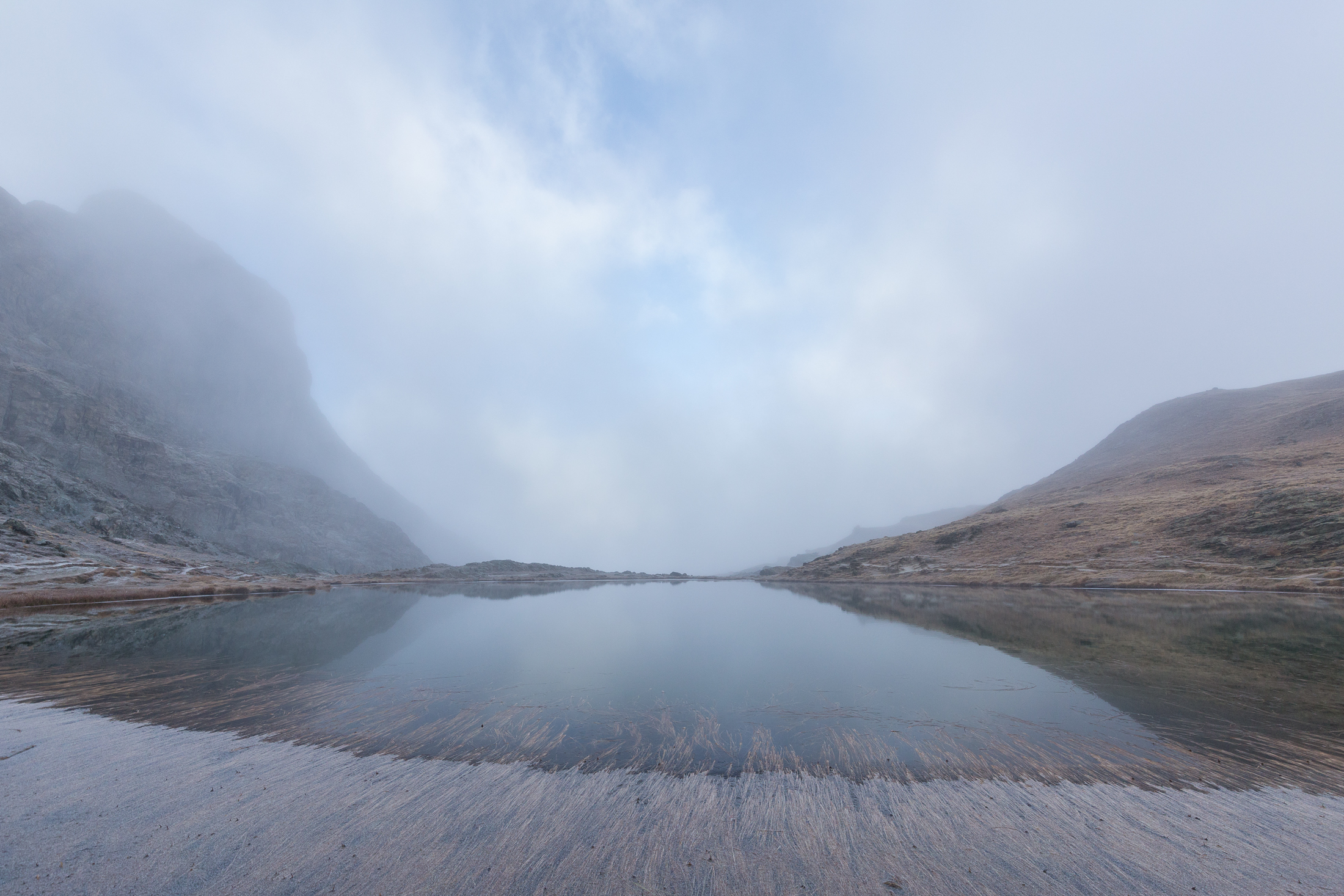 Exhausted from the effort and from the almost lack of sleep the night before, I slept most of the rest of the day, deciding late in the afternoon that I’d give the next day a chance at the lake but only by taking the train up. It turns out I made the right choice: the entire ride up was shrouded in fog, which would have been a frustrating result at the end of the hike had I tried to hike again. Not surprisingly, the Matterhorn itself was also obscured, but this time my panorama was at least successfully stitched; I could print this photo 2 m wide if I want! (Despite this, technically the imagine is still lacking, as I am missing a part of the foreground still. Panoramas are not as easy as they might look.)