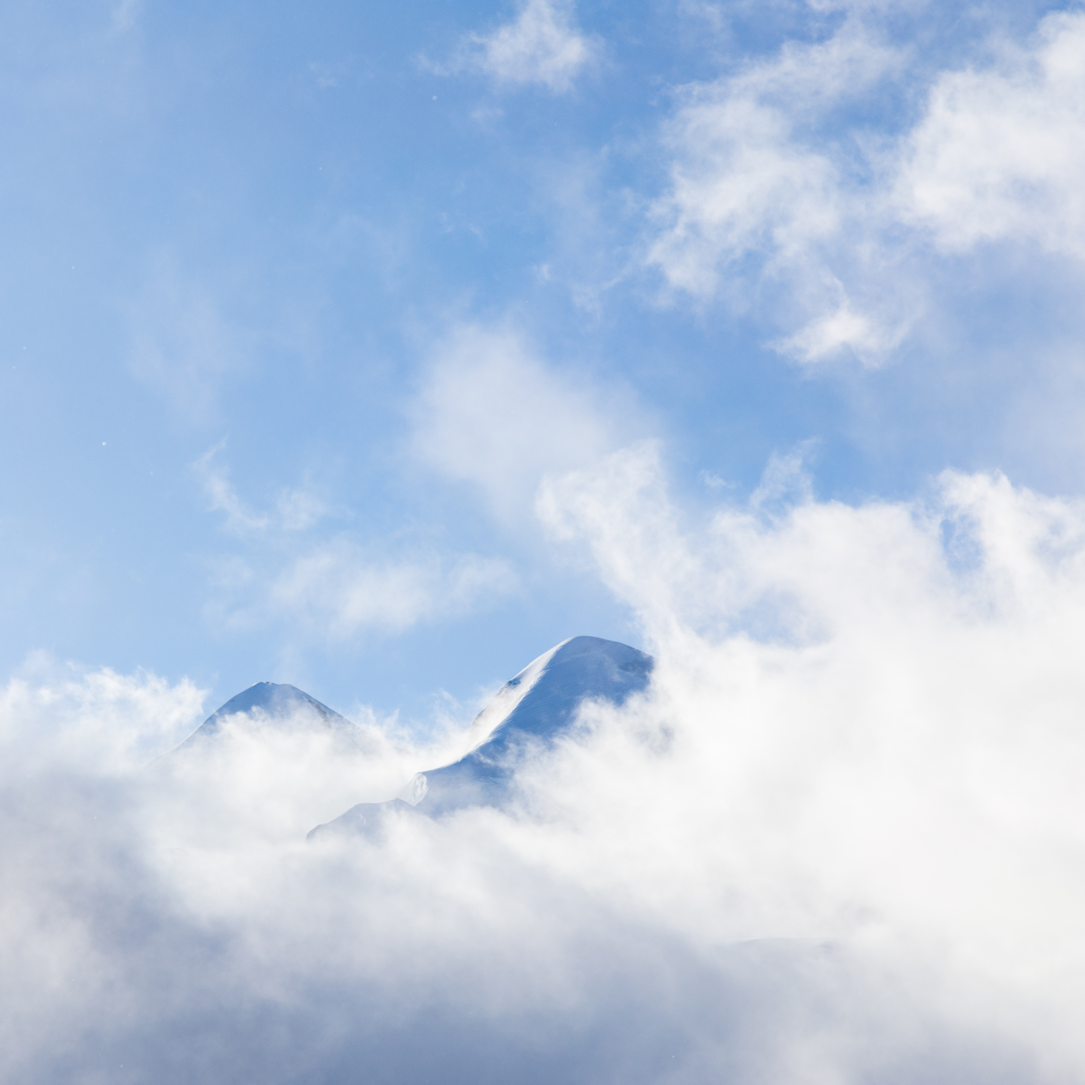 In between, the summits all hid, revealing in between wisps of cloud only their broad lower slopes.