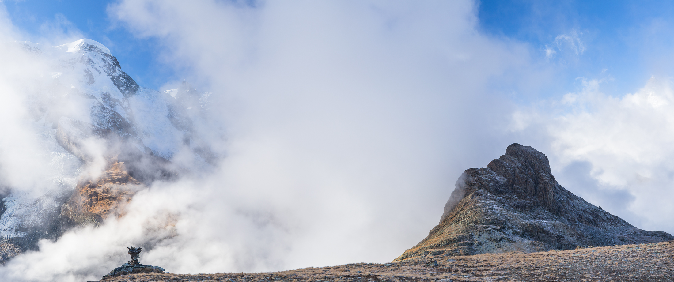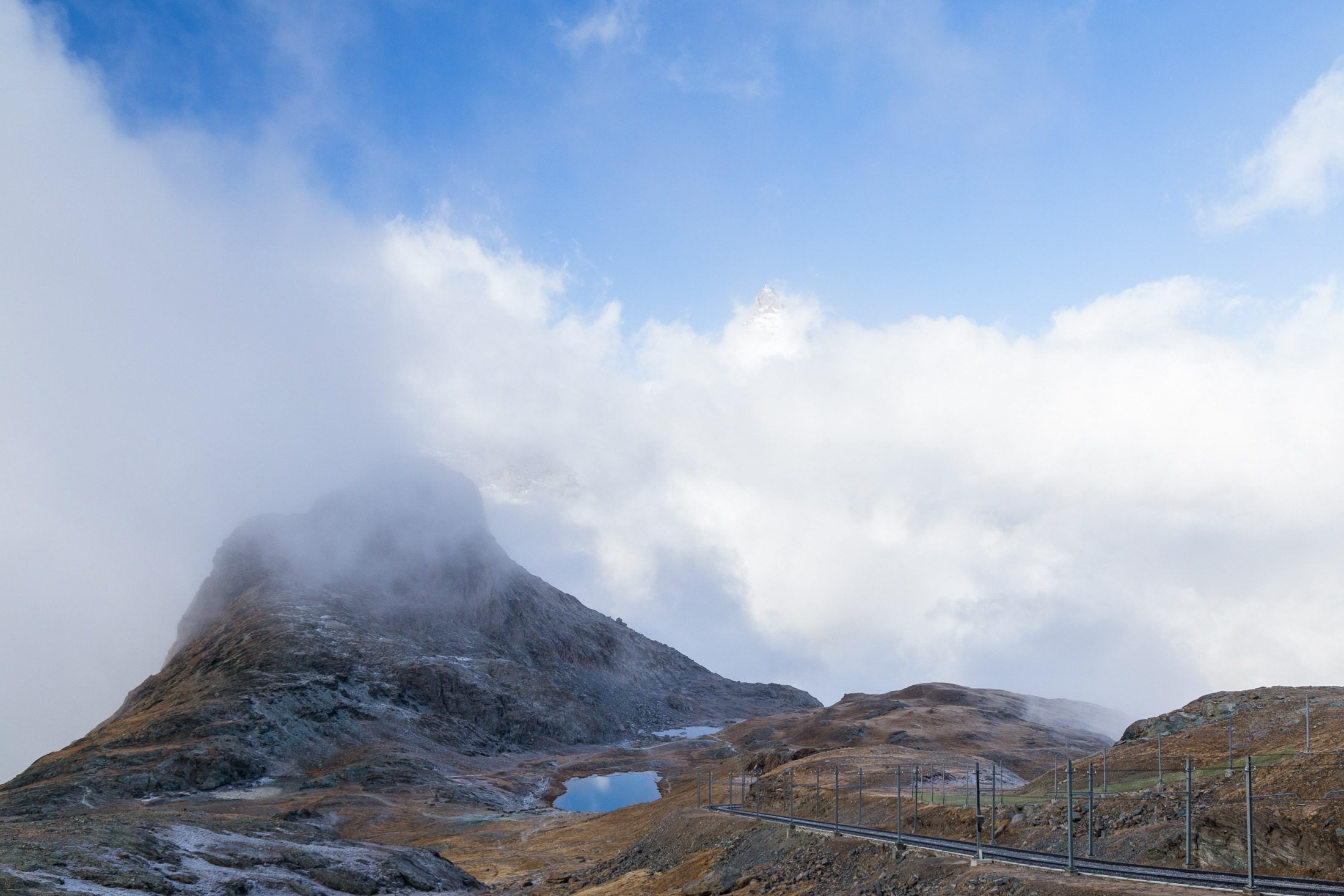 Most of the ground remained dry, although some white showed on the ice that had begun to form at the edges of the lake. The Riffelberg, too, picked up an ashen north face that wouldn’t last in the warmer temperatures in the following days. The most I ever saw from the Matterhorn was its sharp summit, peaking inquisitively above the clouds.